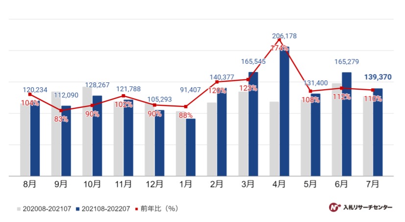 7月の落札案件数の総計は 139,370件で、前年比110%となりました。