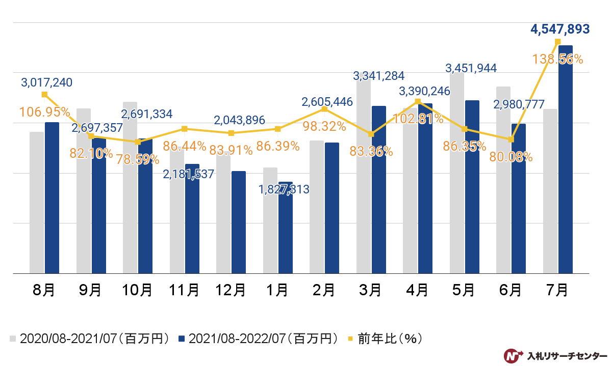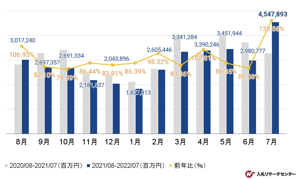2022年7月度は、公示案件数・落札案件数・落札金額共に前年より伸長