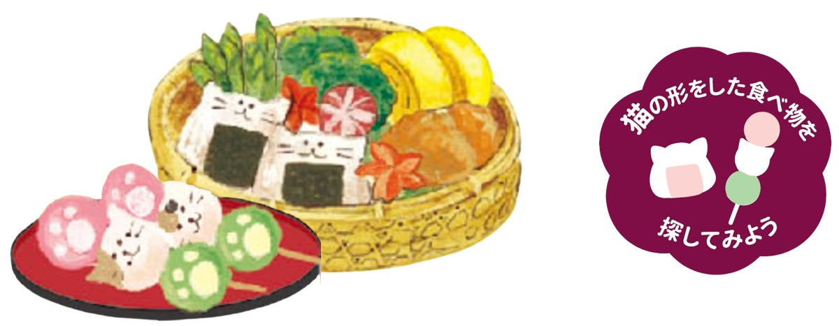 三色団子やお弁当、桜餅などところどころに隠れ猫が潜んでいる遊び心満載のパッケージデザイン。大人可愛いデザインは、 猫好きの方へのプレゼントや自分へのご褒美に最適です。