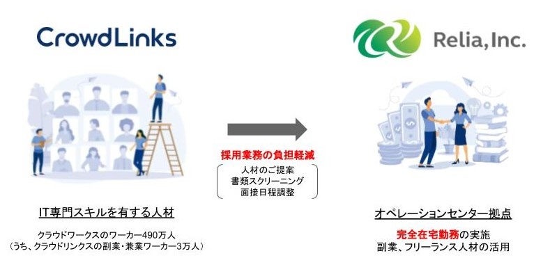 企業と個人をつなぐオンライン人材マッチングプラットフォームを開発・運営する株式会社クラウドワークス(本社:東京都渋谷区 代表取締役社長 兼 CEO:吉田 浩一郎 以下「当社」)が運営するハイクラスな副業・兼業マッチングプラットフォーム「CrowdLinks(クラウドリンクス)」(以下「クラウドリンクス」)は、りらいあコミュニケーションズ社との協業を開始します。情報処理系資格やIT関連業務経験を持つIT副業・兼業人材の採用を支援し、オペレーションセンター人材不足の解消を図ります。