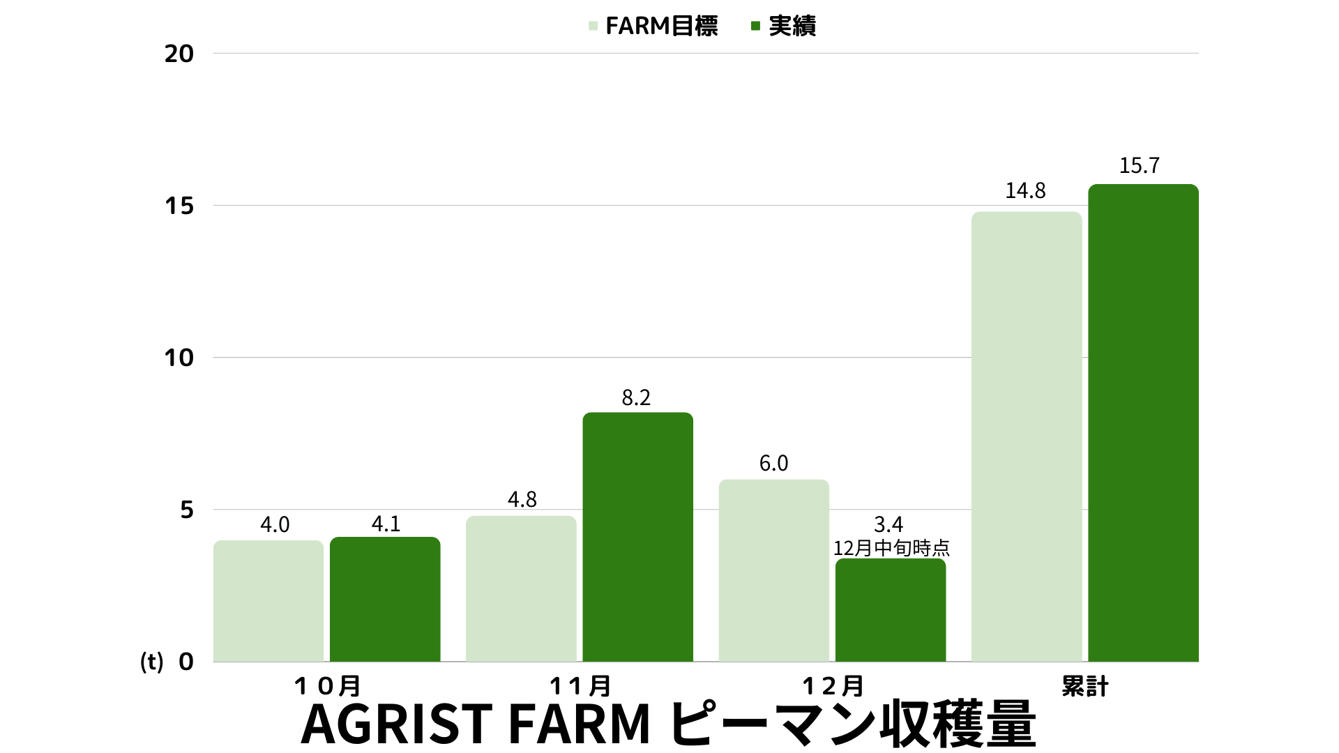 AGRIST FARMでは、養液栽培とICT化でハウスを管理することで、ピーマンの収量を約1.5倍に向上させることを今作の目標にしています。10aあたりの収量は10月から11月にかけて、1.3トン、2.7トンと増加しました。これは、年間目標単収の指標の約1.5倍にあたる年間20トンのペースとなります。