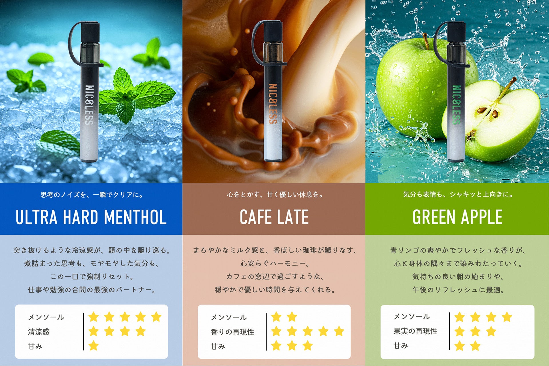 「NICOLESS VAPE 2」は、そうした現代のニーズに応えるニコチンゼロの使い切りVAPEとして開発されました。NICOLESSシリーズの累計販売数は238万本※を突破(※2025年8月時点)しており、前作より吸引可能回数を約1.3倍に増加。しっかりとした吸いごたえと、前作よりさらに芳醇なフレーバーで、罪悪感なく心からリフレッシュできる、新しい“気分転換のスタイル”を提案します。