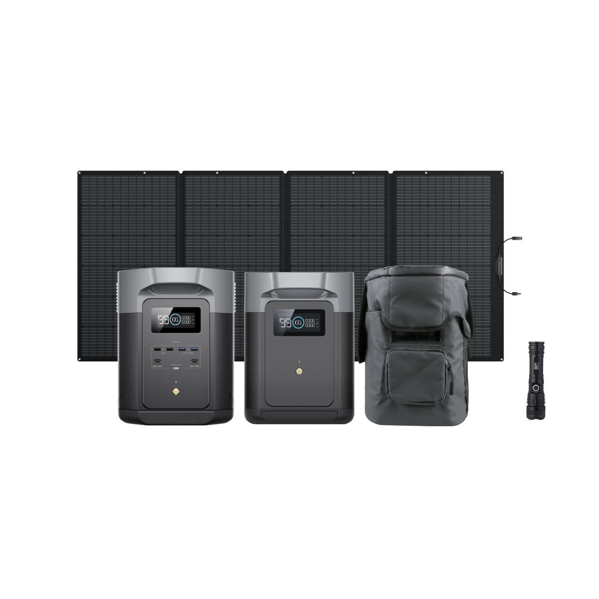 内容: DELTA 2、220W両面受光型ソーラーパネル、DELTA 2専用バッグ、懐中電灯
