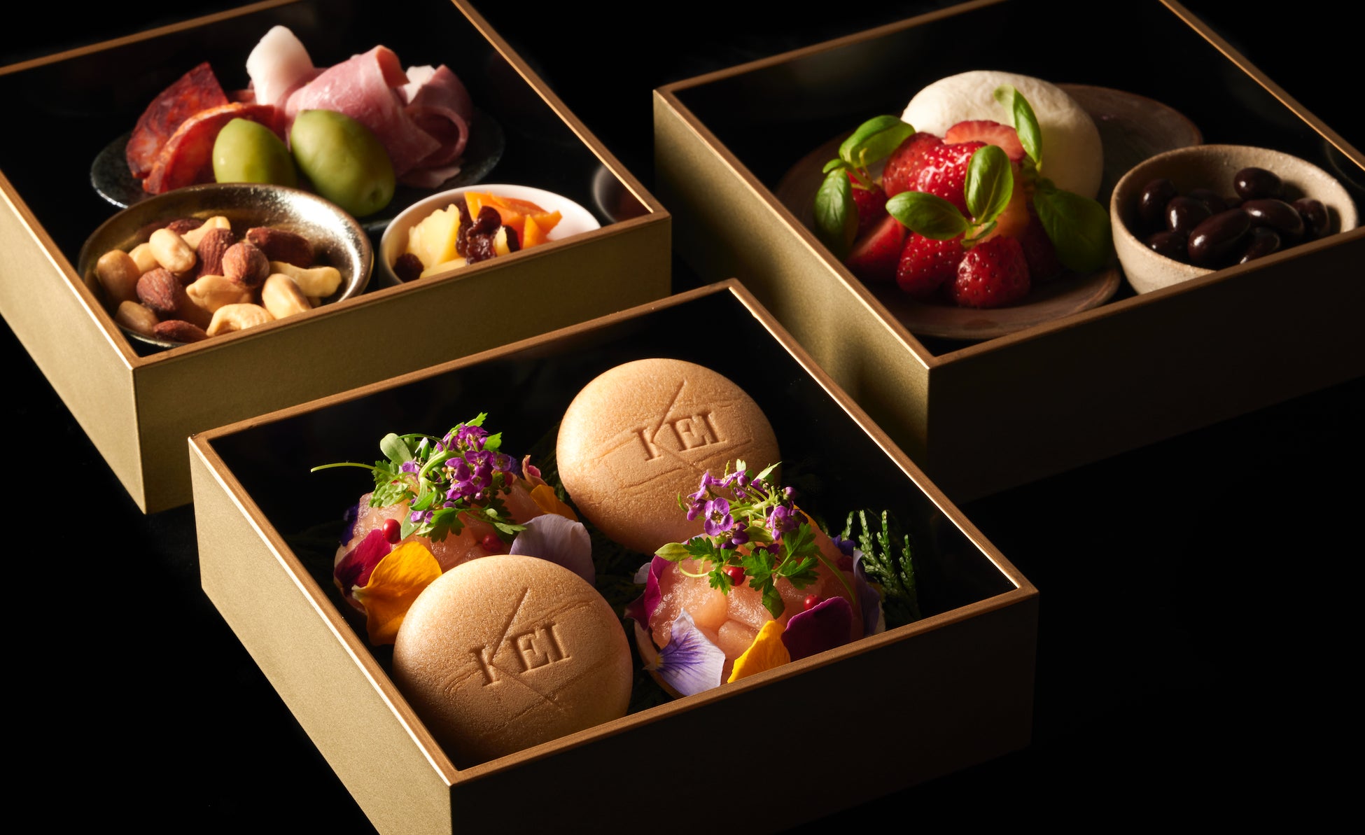 一つは、季節のフルーツのカプレーゼやシグネチャーメニューの一つである最中などが入った、色鮮やかで見た目も美しいお重箱とフリーフローが楽しめる、特別なプラン「KEI Experience」。