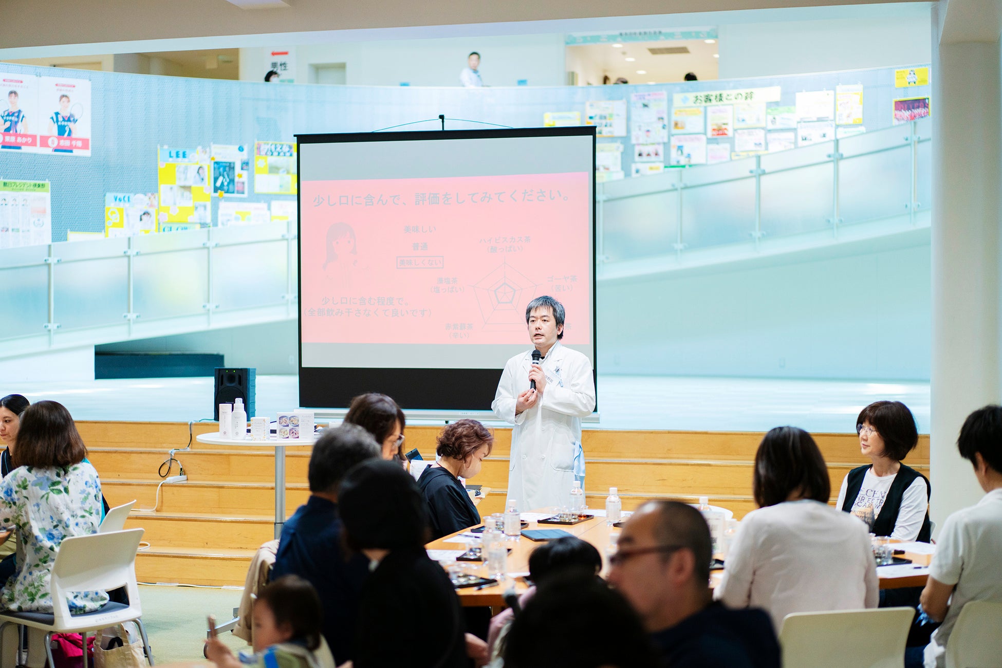 全4コマが即受付終了となるほどの人気プログラムの講師を務めたのは、国際薬膳調理師の資格を持ち、「ご自愛薬膳」(主婦の友社刊)という自著も持つ田野岡亮太。「なんとなく不調」など、今の身体の状態を5種類の漢方茶の「味」で診断する、再春館製薬所ならではのコンテンツです。