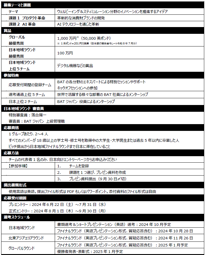 今年の募集テーマは「ウェルビーイング&スティミュレーション分野におけるイノベーションを推進するアイデア」です。ウェルビーイングとは、心身だけでなく社会的にも良好な状態を指し、コロナ禍で高まった健康意識を背景に注目を集めているトピックです。またスティミュレーションとは、一般には刺激や興奮を指す言葉ですが、ここではカフェインなどの成分によって、これまでにない新しい感覚をもたらす製品群を指します。「Battle of Minds 2024」では、この2分野のイノベーションを推し進めるための消費財(FMCG)における革新的なビジネスアイデアを募集します。新しいブランドを提案する「プロダクト革命」の課題、もしくは企業が新製品のアイデアを調達、生成、検証できるようにする AI ツールを考える「AI革命」の課題、いずれかの課題から応募できます。