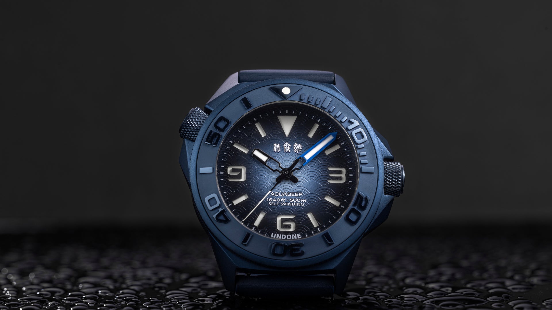 UNDONEの本格ダイバーズウォッチAquadeepが、「神奈川沖浪裏」の荘厳な美しさを引き立てます。葛飾北斎の傑作からインスピレーションを得た、日本の伝統美と最新技術を融合した『新たな波』を表現。伝統文様の青海波がエンボス加工された文字盤に、北斎館のロゴが輝きます。