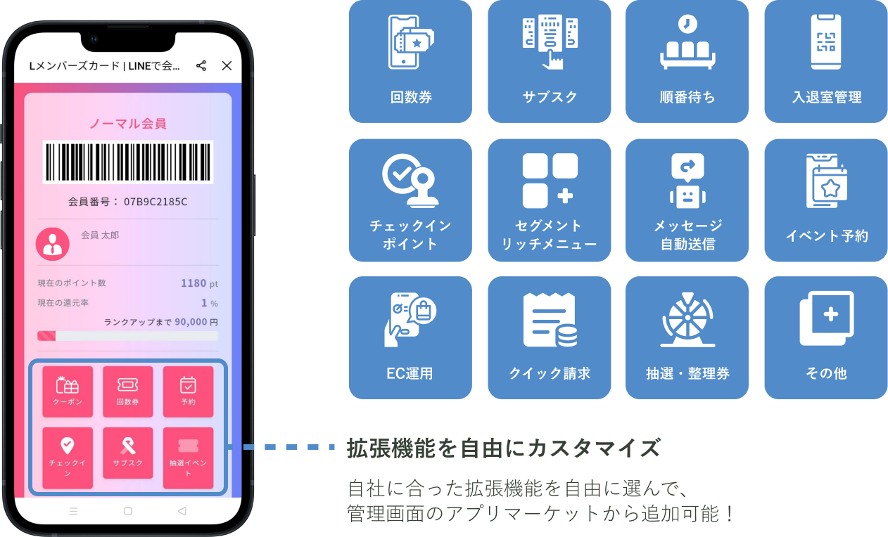 Lメンバーズカードでは、様々な業種に対応した15種類以上の拡張機能を追加料金なしで利用 できます。