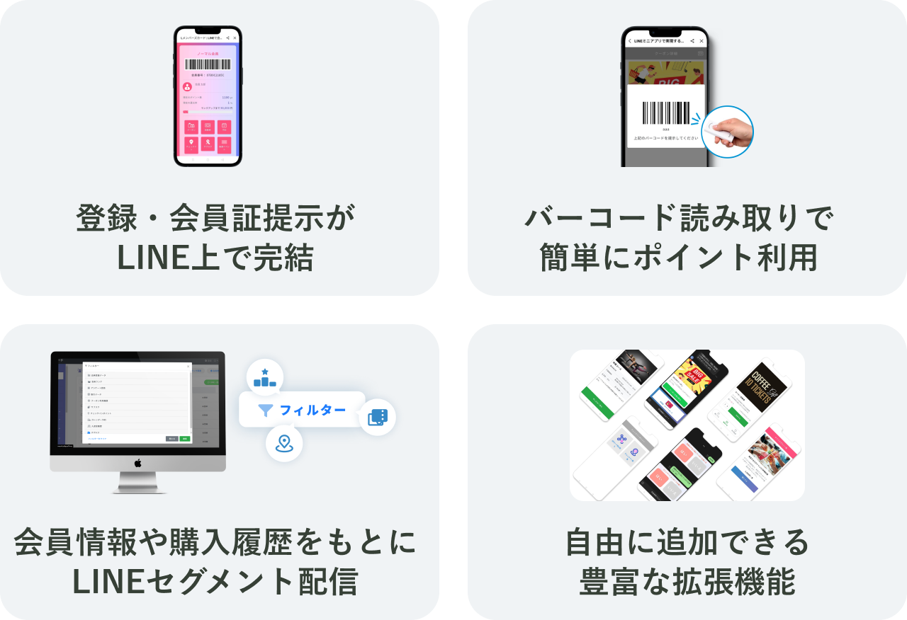 Lメンバーズカードでは、「デジタル会員証」「LINEメッセージ配信」「顧客管理・分析」「リピート施策」にそれぞれ特化した基本機能が利用可能です。