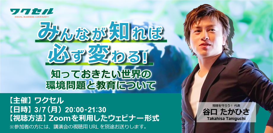 ソーシャルビジネスコミュニティ ワクセル(主催:嶋村吉洋)は、3/7(月)20:00から、環境活動家の谷口たかひささんのオンライン講演会を開催します。