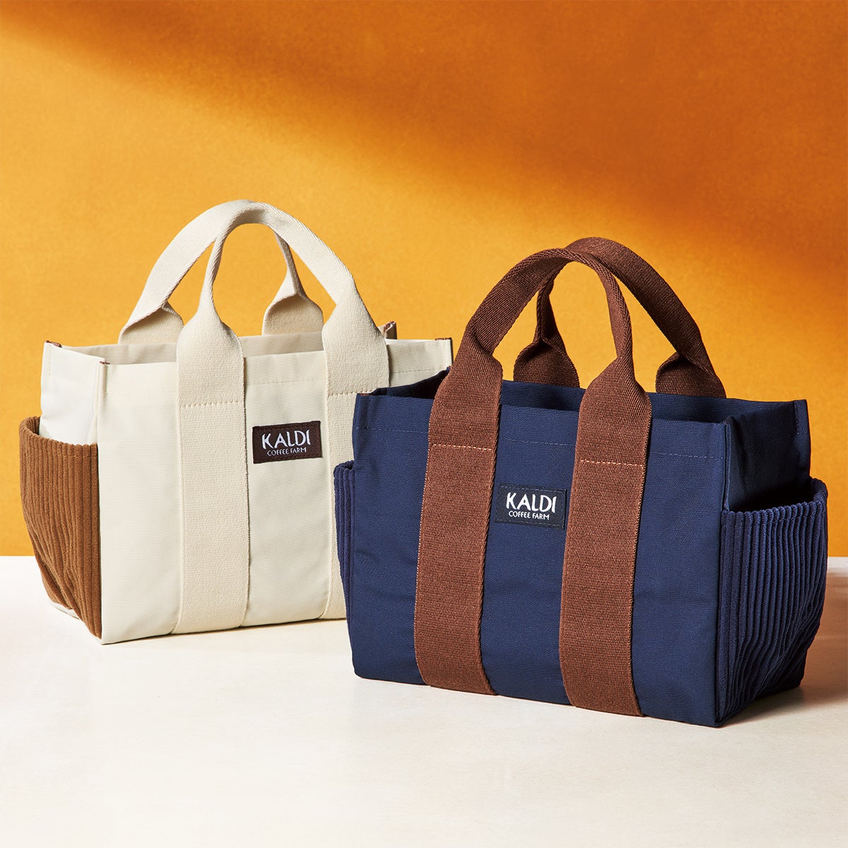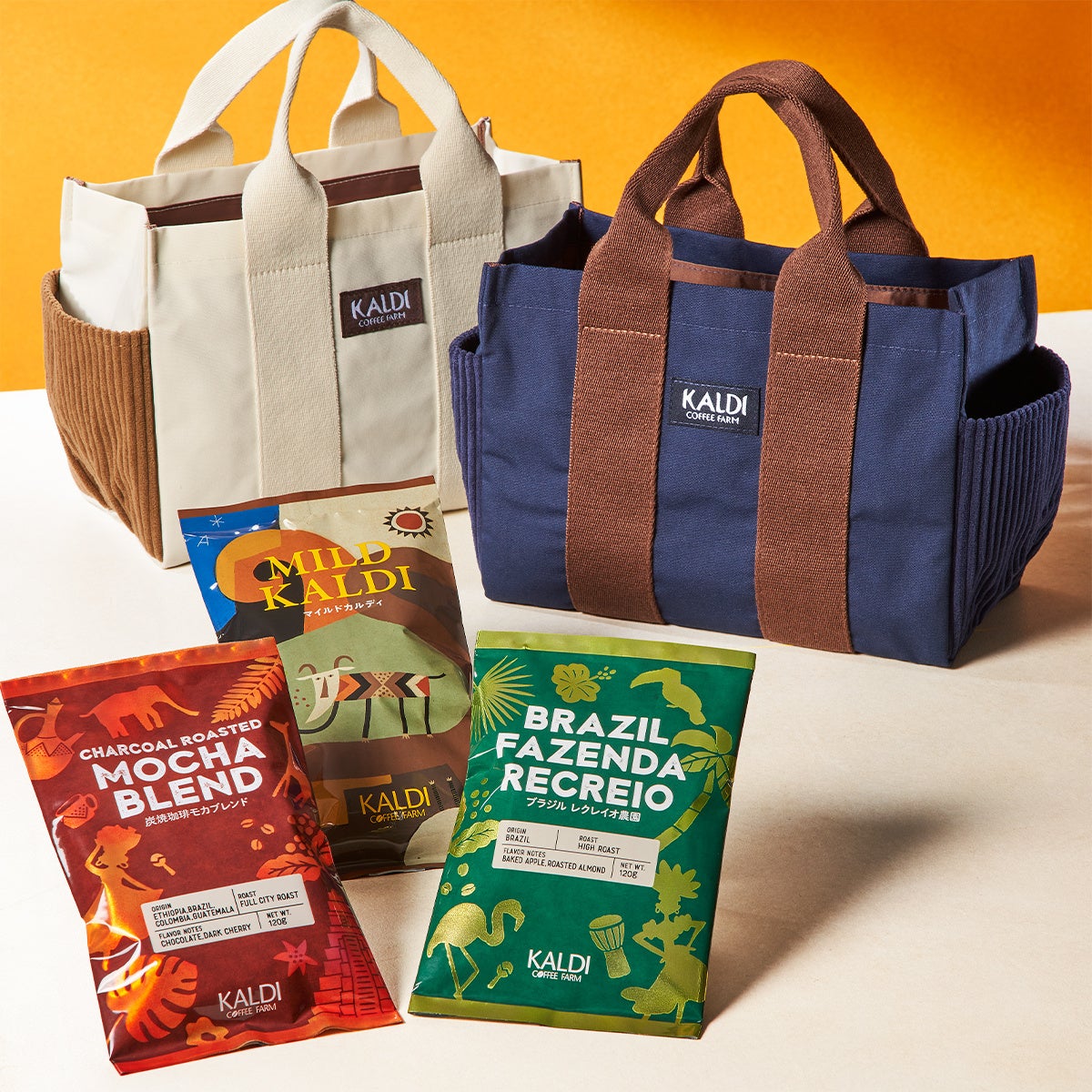ブラジル豆本来のやさしい甘さを引き出した人気No.1ブレンド「マイルドカルディ」、芳ばしく華やかな香りの「炭焼珈琲モカブレンド」、焼きリンゴのような風味の「ブラジル レクレイオ農園」の3種のコーヒー豆を、温かみのあるコーデュロイ生地のサイドポケットが付いたバッグにセットしました。 バッグは、ホワイトとネイビーの2色からお選びいただけます。