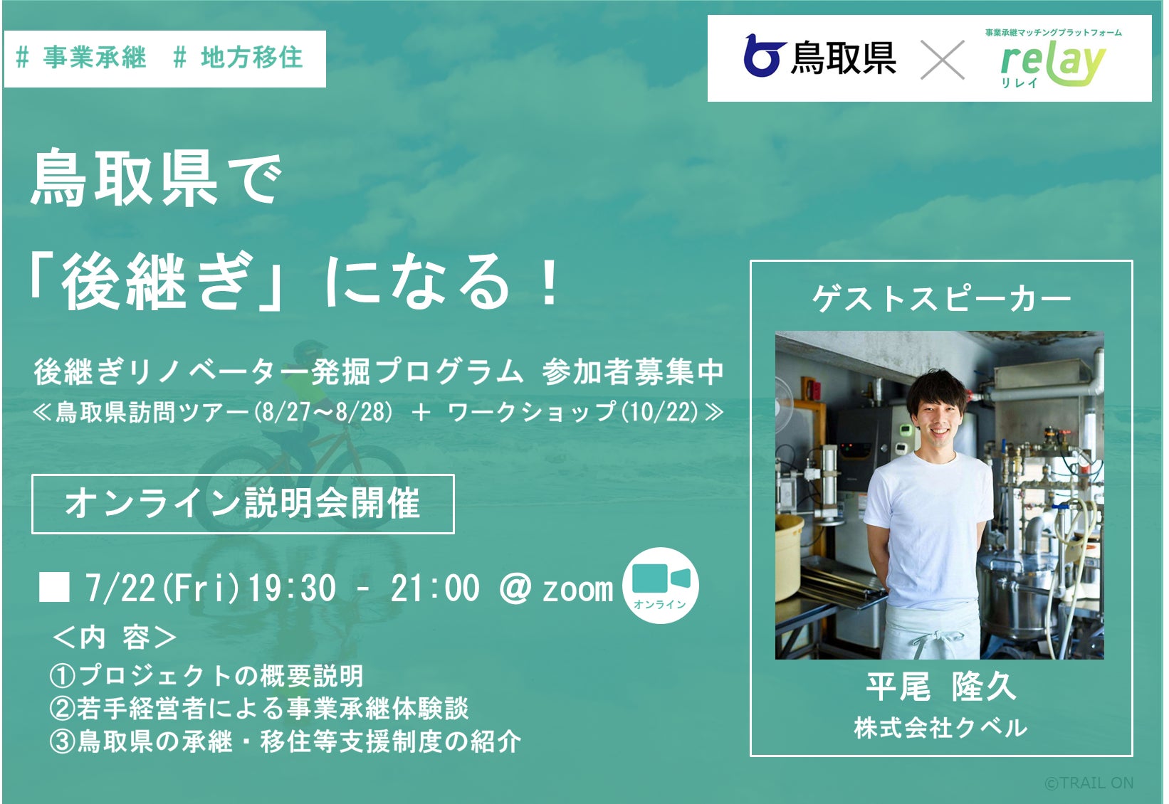 この度、プログラムの実施に先立ち、オンラインでの説明会を開催いたします。実際に鳥取県内で事業承継を経験された、株式会社クベルの平尾 隆久さんにご登壇いただき、事業承継という選択肢のリアルな側面や鳥取県での暮らしなどについて、伺います。もちろん、訪問ツアーやワークショップの詳細についてもご案内いたします。