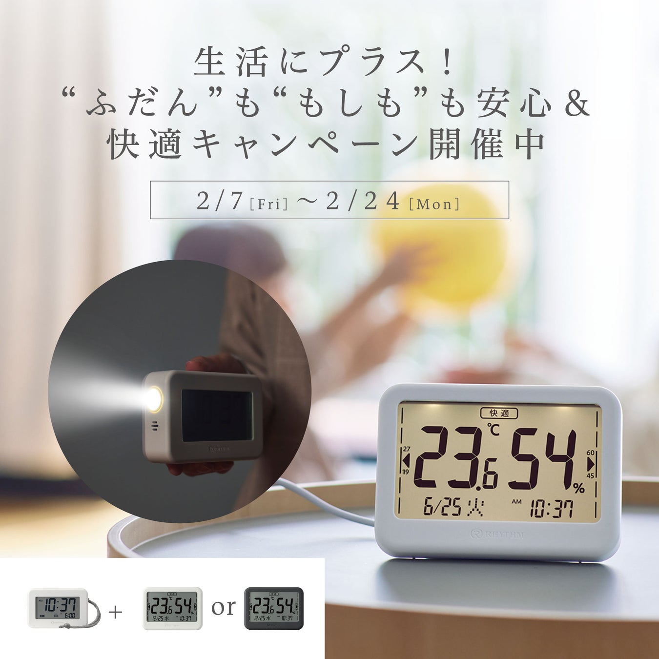 リズム株式会社(取締役社長 湯本武夫)は、フォロー&コメントで、いつでも見やすい、体調管理に役立つくつろぎの温湿度計「COMFOMETER」と、もしもの時も灯る、くつろぎのランタンクロック「LANTERNCLOCK」のセットが当たるSNSキャンペーンを、2025年2月7日(金)~ 2月24日(月)まで実施します。