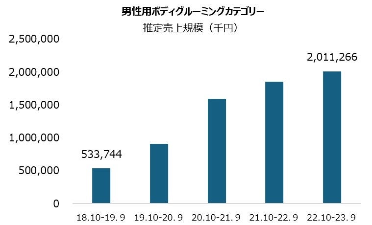 男性の美意識の高まりにより、年齢を問わず、男性のボディグルーミングへの関心が高まっています。男性のボディグルーミング市場は5年前と比較して金額規模で約4倍伸⻑し、2023年9月時点で、約20億円にまで成⻑しています。
