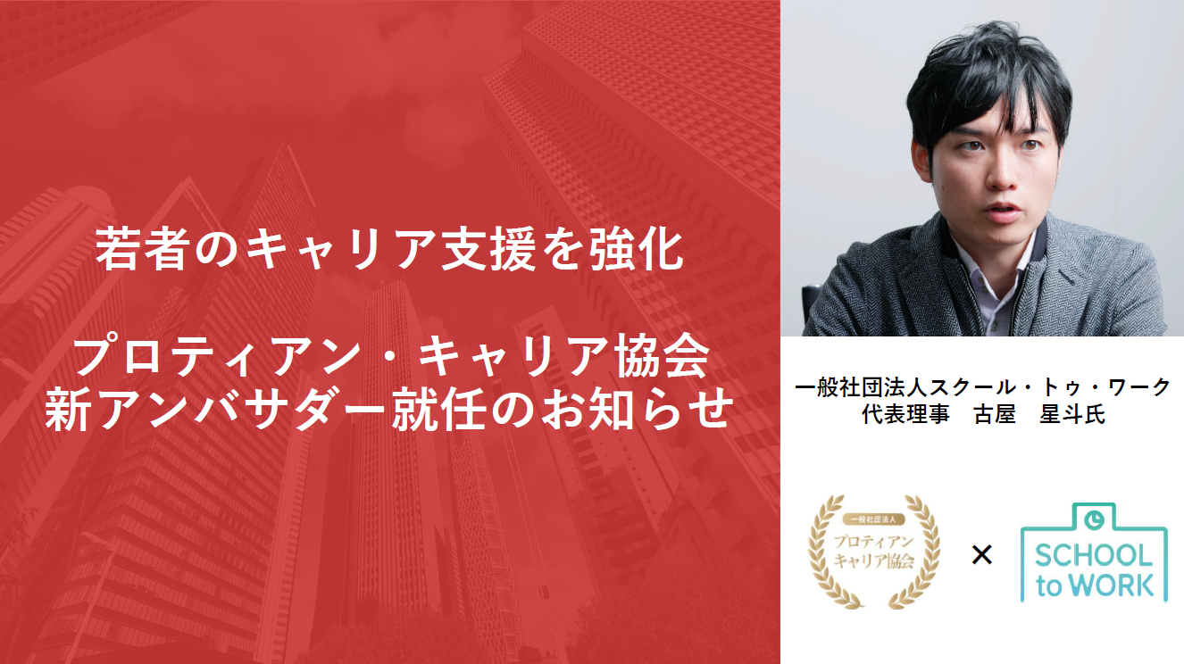 一般社団法人プロティアン・キャリア協会 (東京都新宿区、代表理事:田中研之輔・有山徹、以下、「当協会」)は、若者のキャリア支援の強化に向けて、一般社団法人スクール・トゥ・ワーク代表理事の古屋 星斗氏を当協会アンバサダーに迎えることを決定しましたことをお知らせいたします。