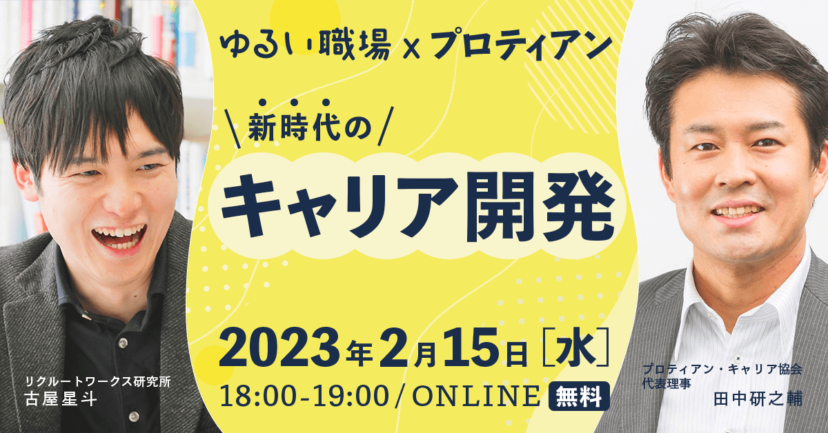 新時代の若者・仕事・日本社会を紐解く『ゆるい職場』著者であり、一般社団法人スクール・トゥ・ワーク代表理事を務める古屋星斗氏と、法政大学キャリアデザイン学部教授、プロティアン・キャリア協会代表理事の田中研之輔先生による、「新時代のキャリア開発」対談イベントを2023年2月15日に開催いたしました。