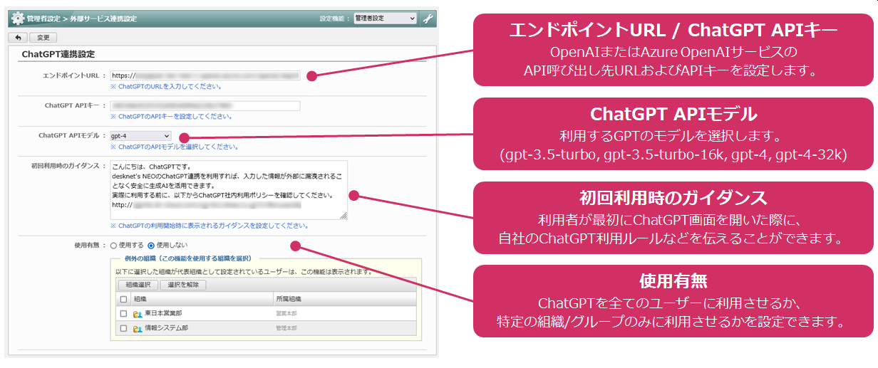 同機能はdesknet's NEO / ChatLuckの標準機能として搭載され、既にご利用中のお客さまは追加料金なく本機能を利用できます。(本機能の利用には、別途OpenAI社またはマイクロソフト社から取得できる「OpenAI APIキー」が必要になります)