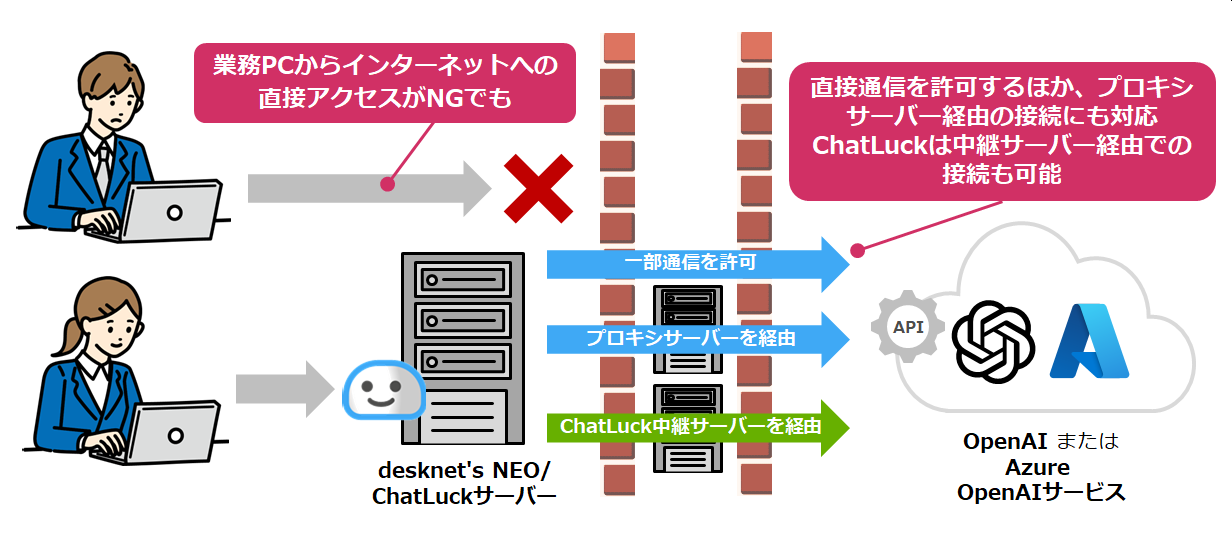 desknet's NEO / ChatLuckをオンプレミス導入し、ユーザー端末からのインターネット接続を制限している環境でも、本機能を利用できます。(desknet's NEOの場合はプロキシサーバー経由、ChatLuckの場合はプロキシサーバーまたはChatLuck中継サーバーを経由)
