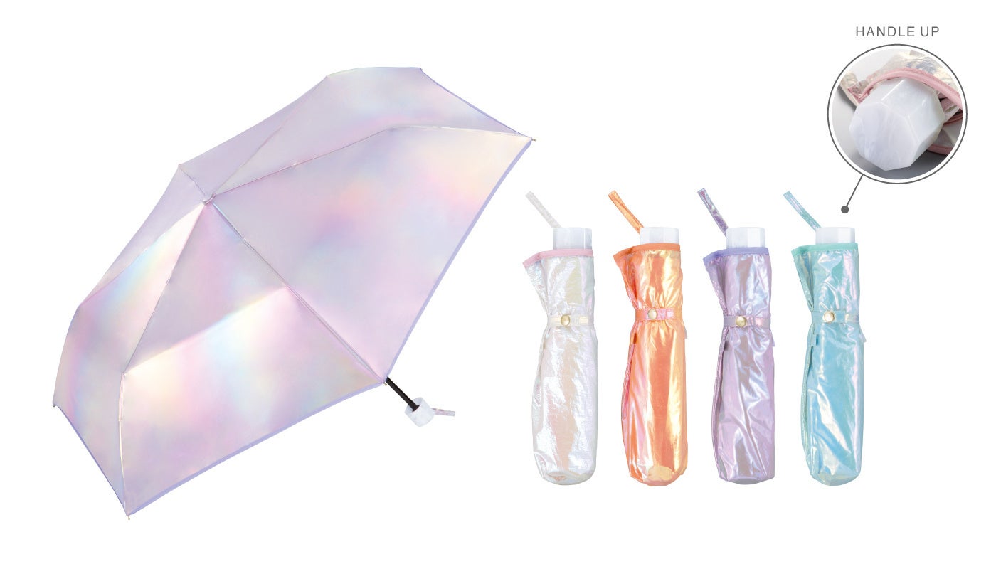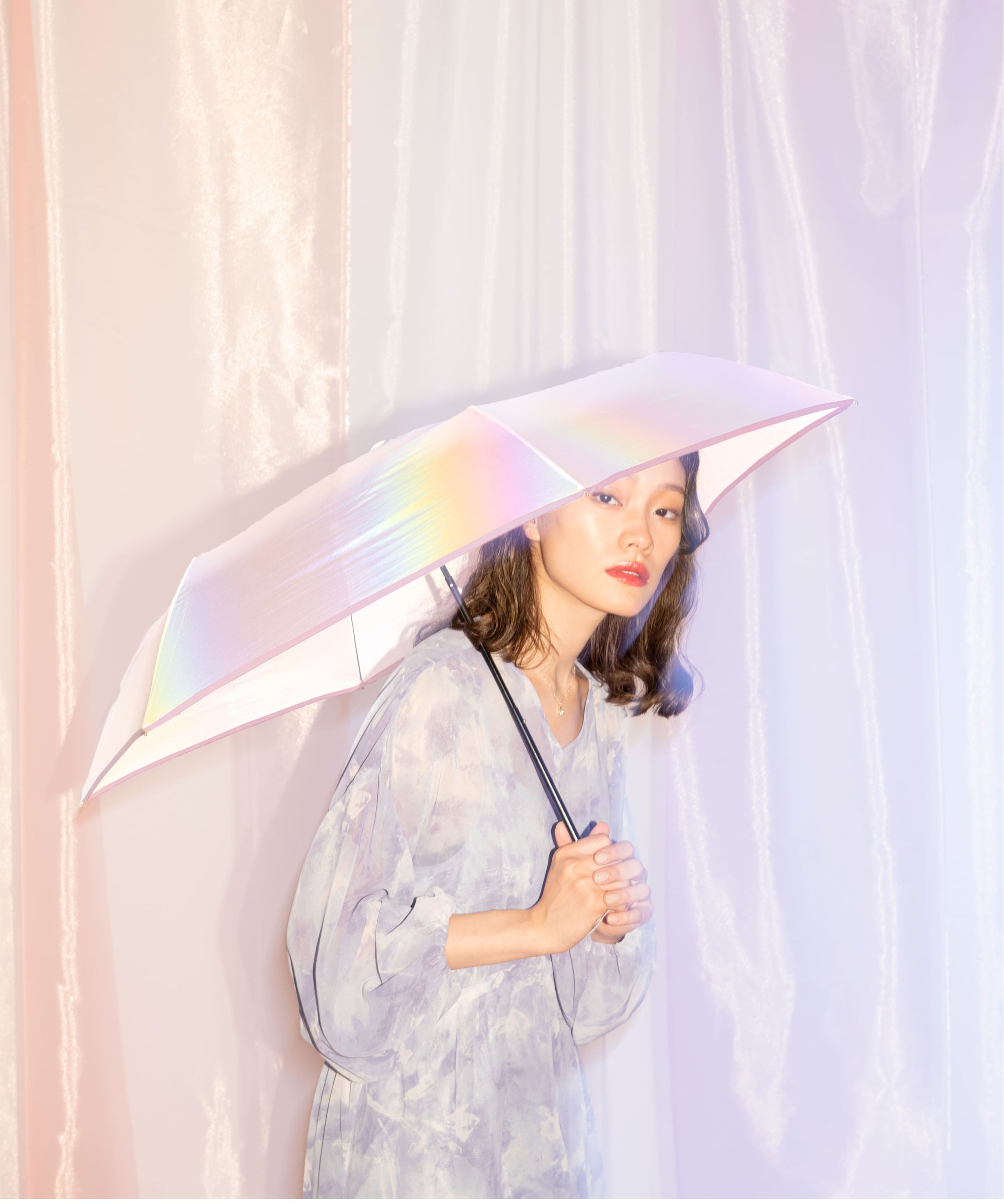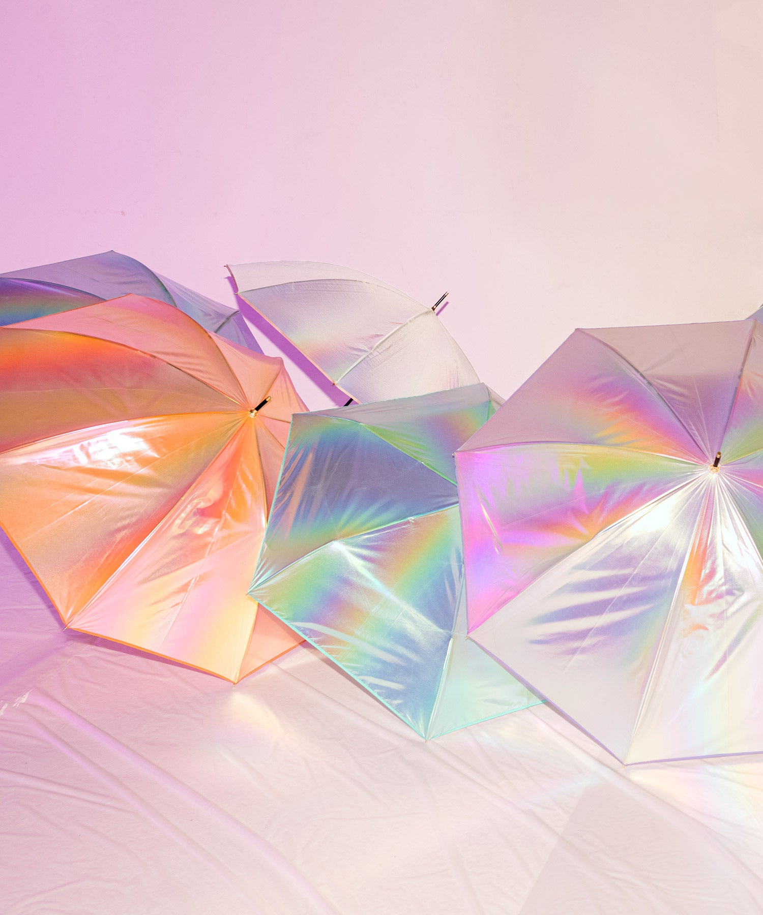 光の当たり方や強弱、見る角度によって色が変化する不思議な傘。光沢のある生地はパールのような輝きを放ち、様々な表情を見せてくれます。また雨が降ると雨粒が生地の光に反射するので、その瞬間だけの特別な姿も楽しむことができます。