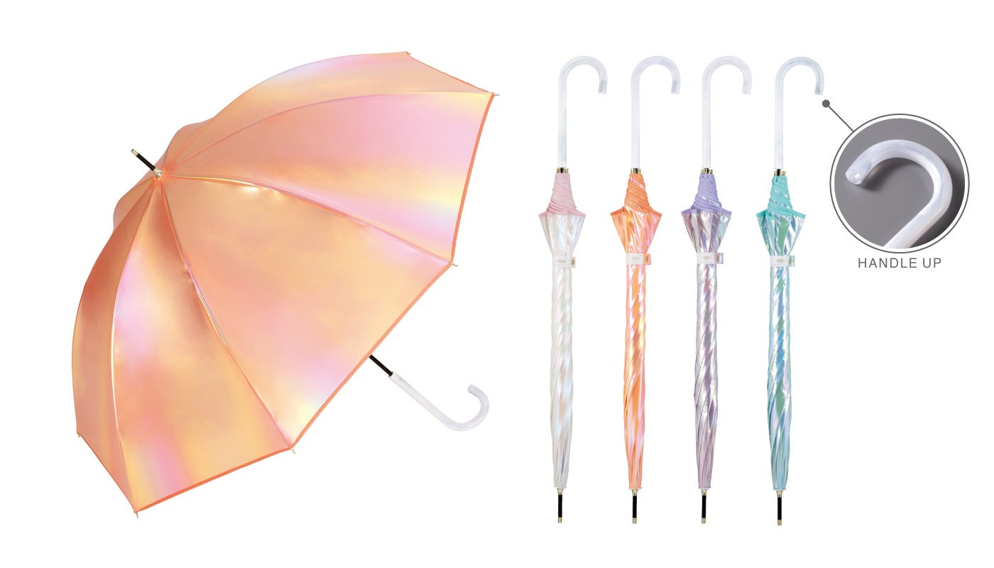 長傘と折りたたみ傘、それぞれ4色展開となり、どのカラーもコーディネートの主役になるような鮮やかな色合いです。また傘の持ち手には大理石をイメージしたマーブル調の持ち手を合わせ、洗練された雰囲気を演出します。