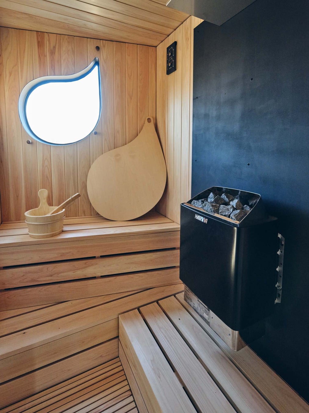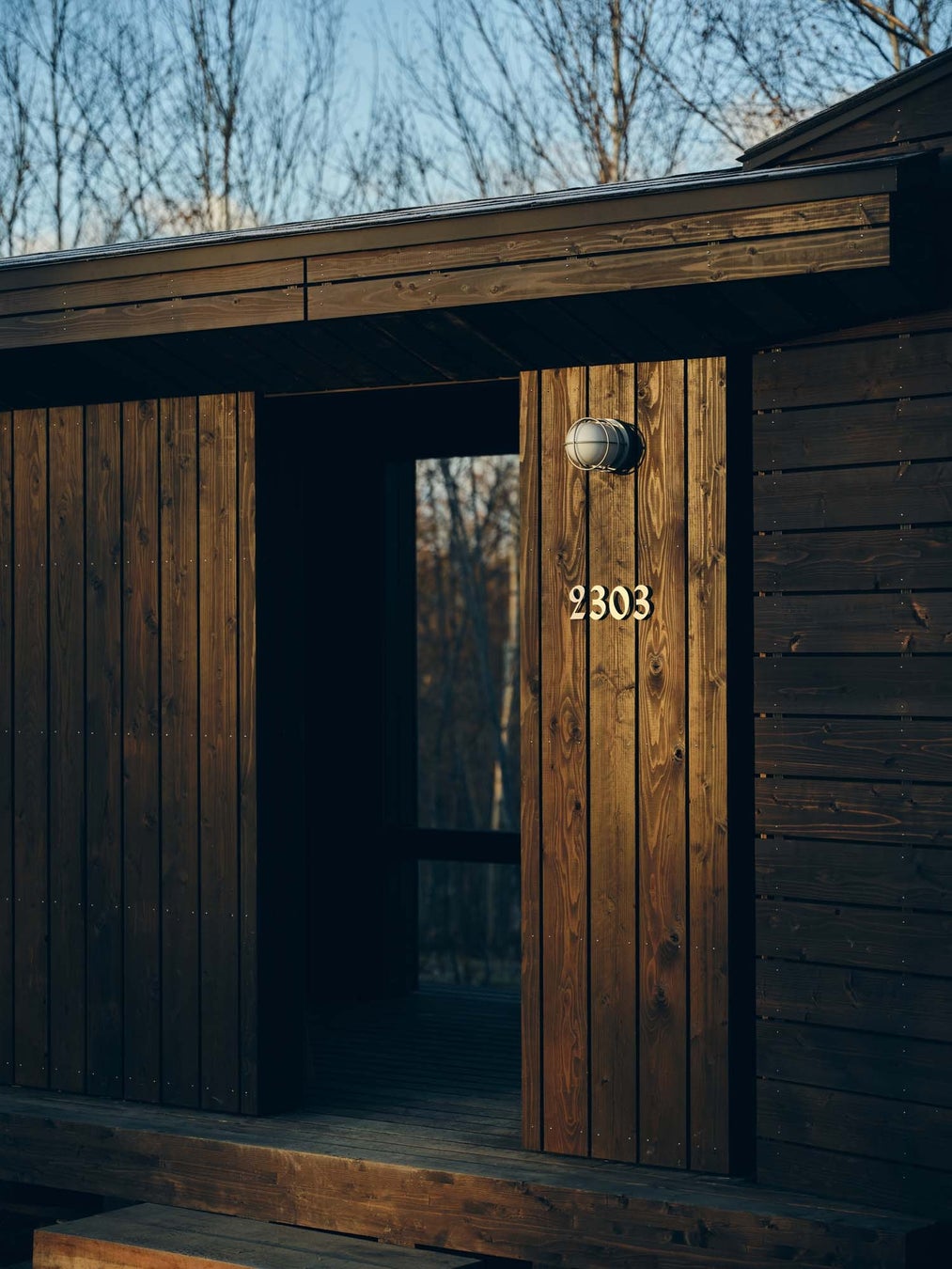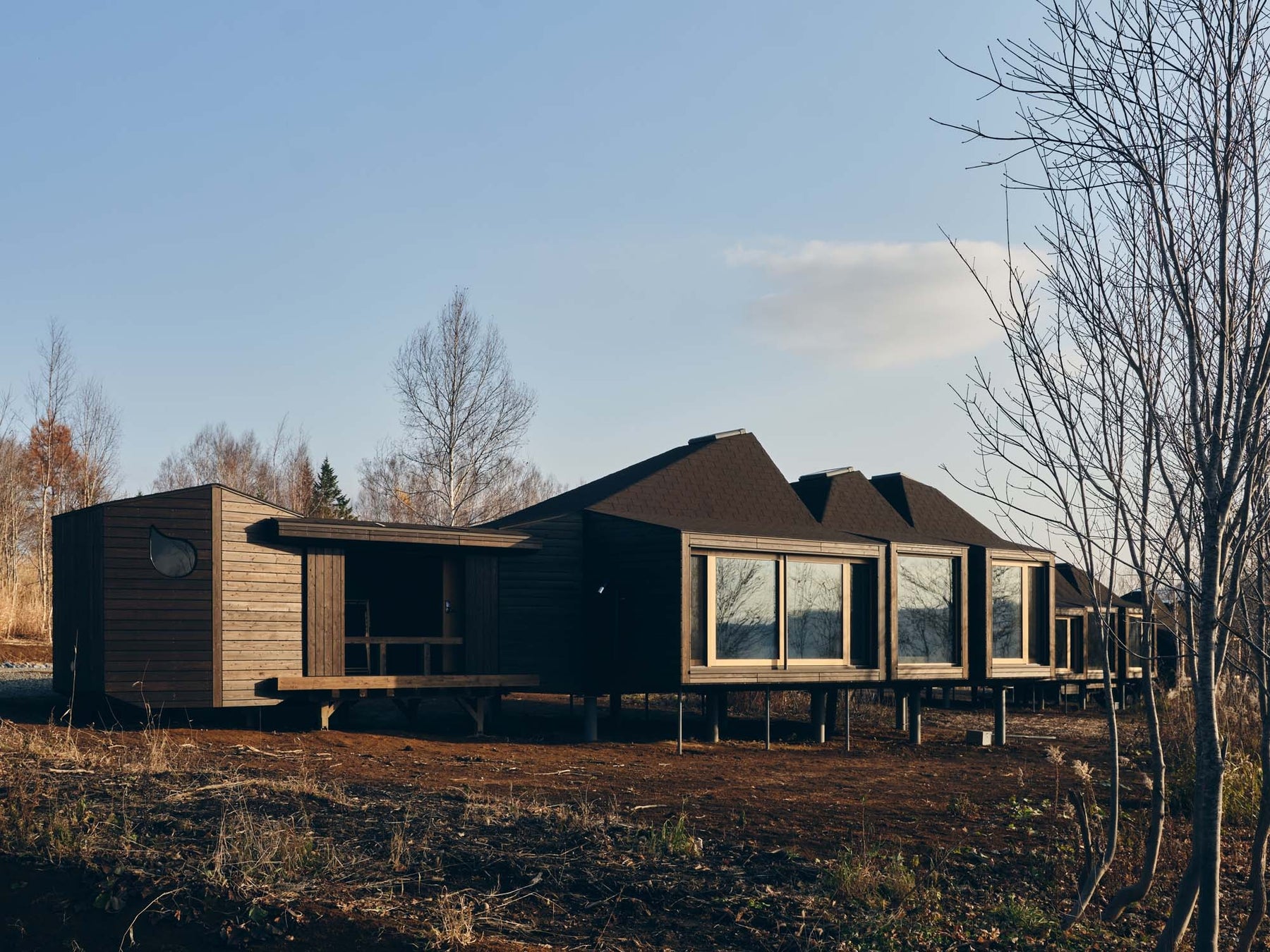 大開口が印象的なキャビンは、ゲレンデ至近の立地にあり、全室にプライベートサウナを完備。雪景色に映える黒を基調とした外観が、冬のニセコでの時間をより心地よくしてくれます。