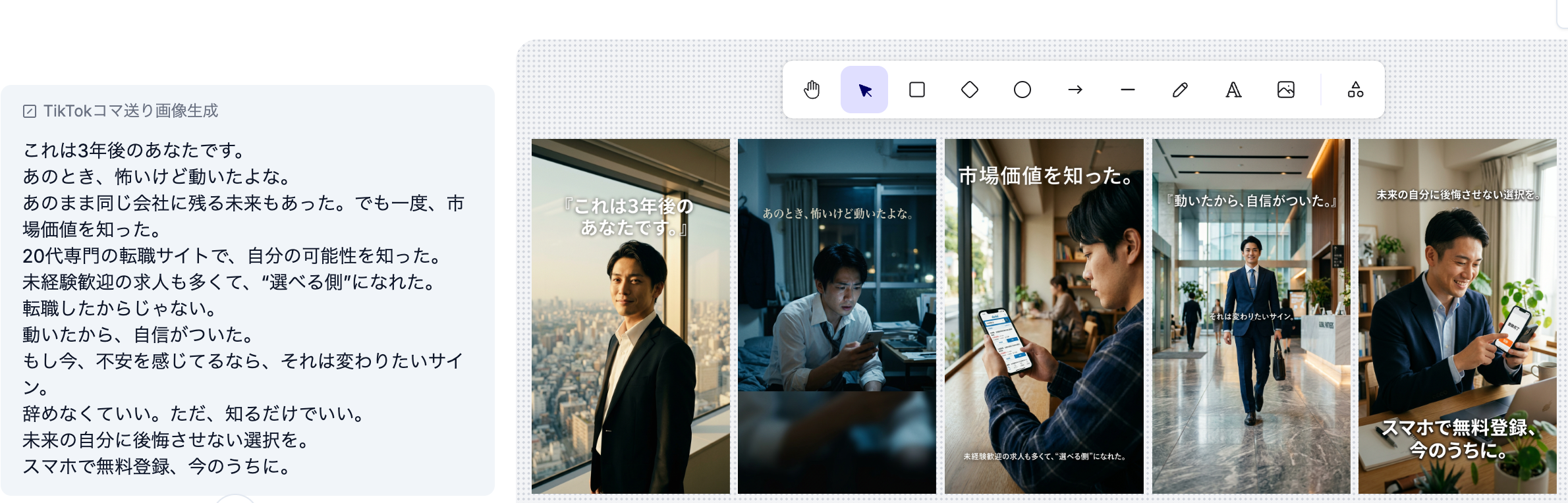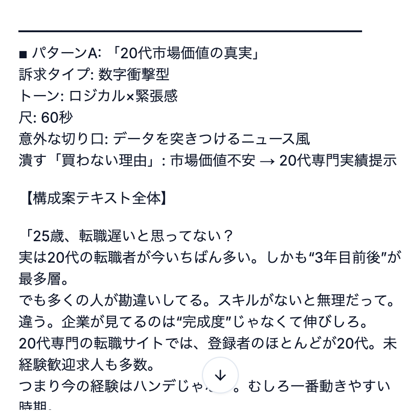 「どんなペルソナに」「どんな悩みに刺しに行くか」というマーケ戦略の核心部分をAIが担うため、経験の浅い担当者でもクオリティの高い構成案を短時間で手にできます。