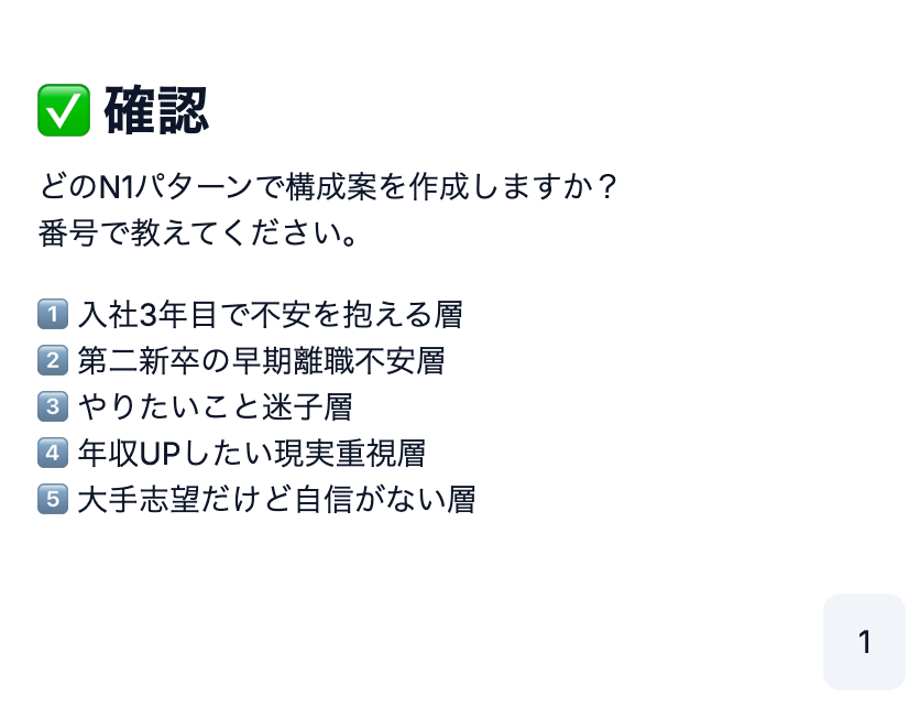 AIがN1を自動提案、選ぶだけ。最長10分のやり取りで5パターンの構成案が完成。