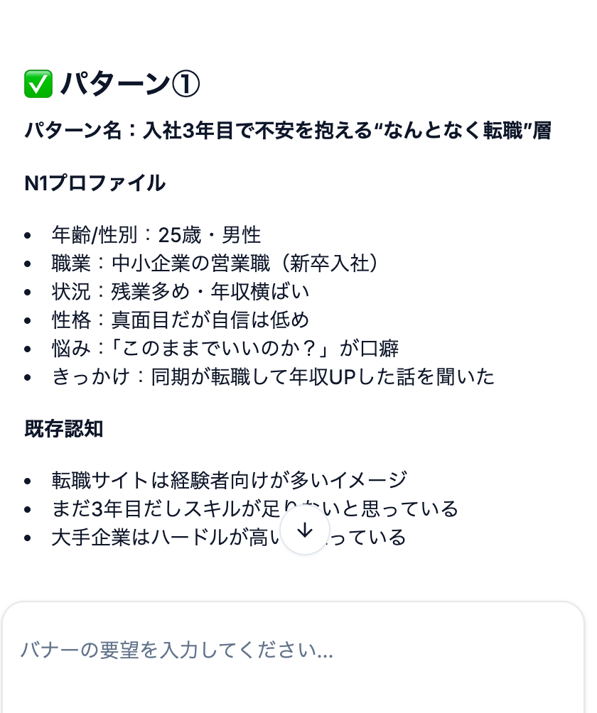 サービス名とLPのURLを送信するだけで、ターゲットユーザー(N1)を複数提案。選んだN1に対してAIが深掘り分析を行い、刺さる動画構成案を5パターン一気に出力します。