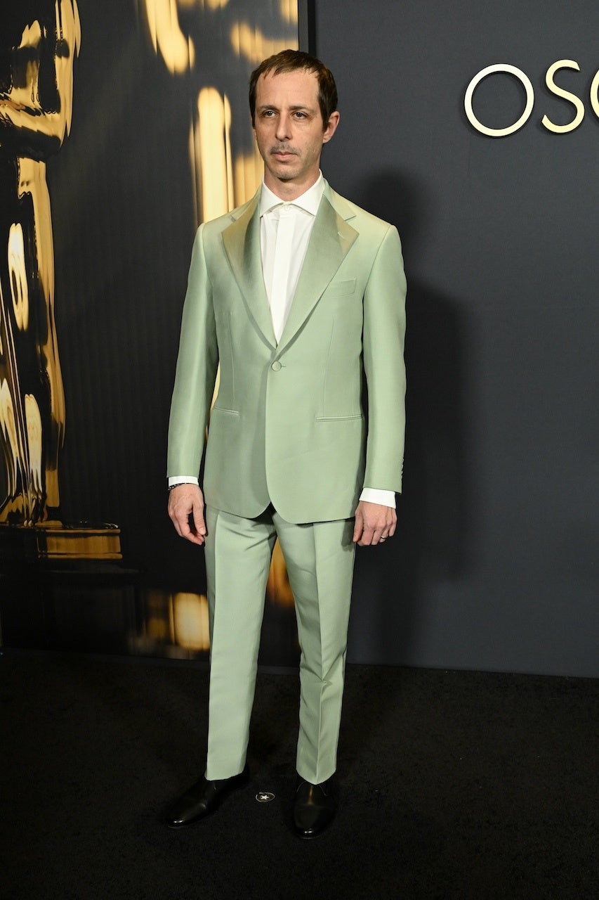 俳優のジェレミー・ストロングは、第15回ガバナーズ賞授賞式にて、淡いセージ色のウールとシルク混紡のロロ・ピアーナのカスタムメイドのスーツを着用して出席しました。