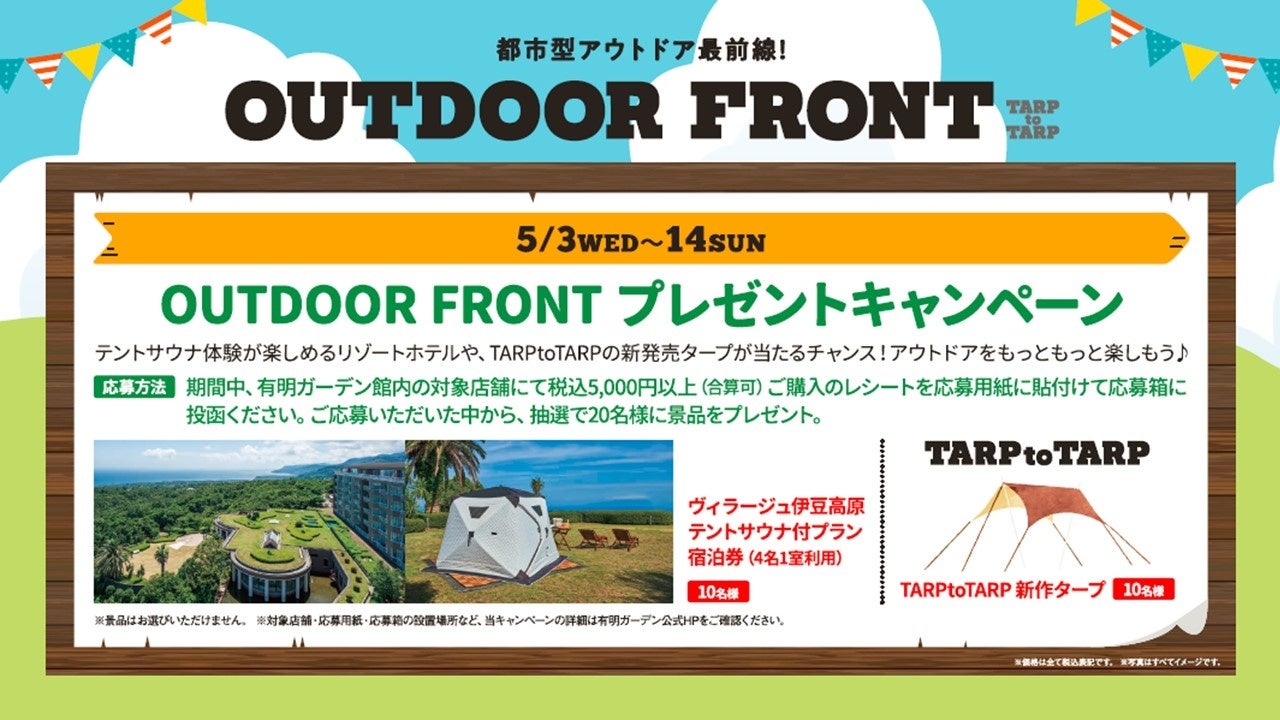 [イベント概要] 開催時間|屋外 10:00~18:00(日曜日は17:00まで)、中央吹抜広場 12:00~20:00 主催|住友不動産商業マネジメント株式会社 協力|TARPtoTARP(タープトゥタープ) イベント内容| ●プレゼントキャンペーン ●OUTDOOR FRONT×TARPtoTARPコラボ商品販売 ●アウトドアサウナ体験 ●サウナグッズ ポップアップショップ ●天然温泉足湯体験 ●大江戸ビール祭り2023春 ●屋外アウトドア物販 ●TARPtoTARPtoCAMP(キャンプスタイル見学) ●テント設営説明会 ●Dino Camp 恐竜ワークショップ ●「Weber」グリルアカデミーキッズ ●ゴースローキャラバン クマTEEぬりえワークショップ ●親子で薪割り・焚き火体験、夜の焚き火見学会 ●「ランドローバー」 ディフェンダーでオフロード体験 ●BMW東京車両展示 ●ストライダーエンジョイカップ 有明 OUTDOOR FRONT ステージ ●有明カーツーリズムフェスタ2023 ●FOODとLUCK in 有明 OUTDOOR FRONT ●「FUNFORT×Rollercam」車両展示 ●公園の防災施設を周る謎解きラリー