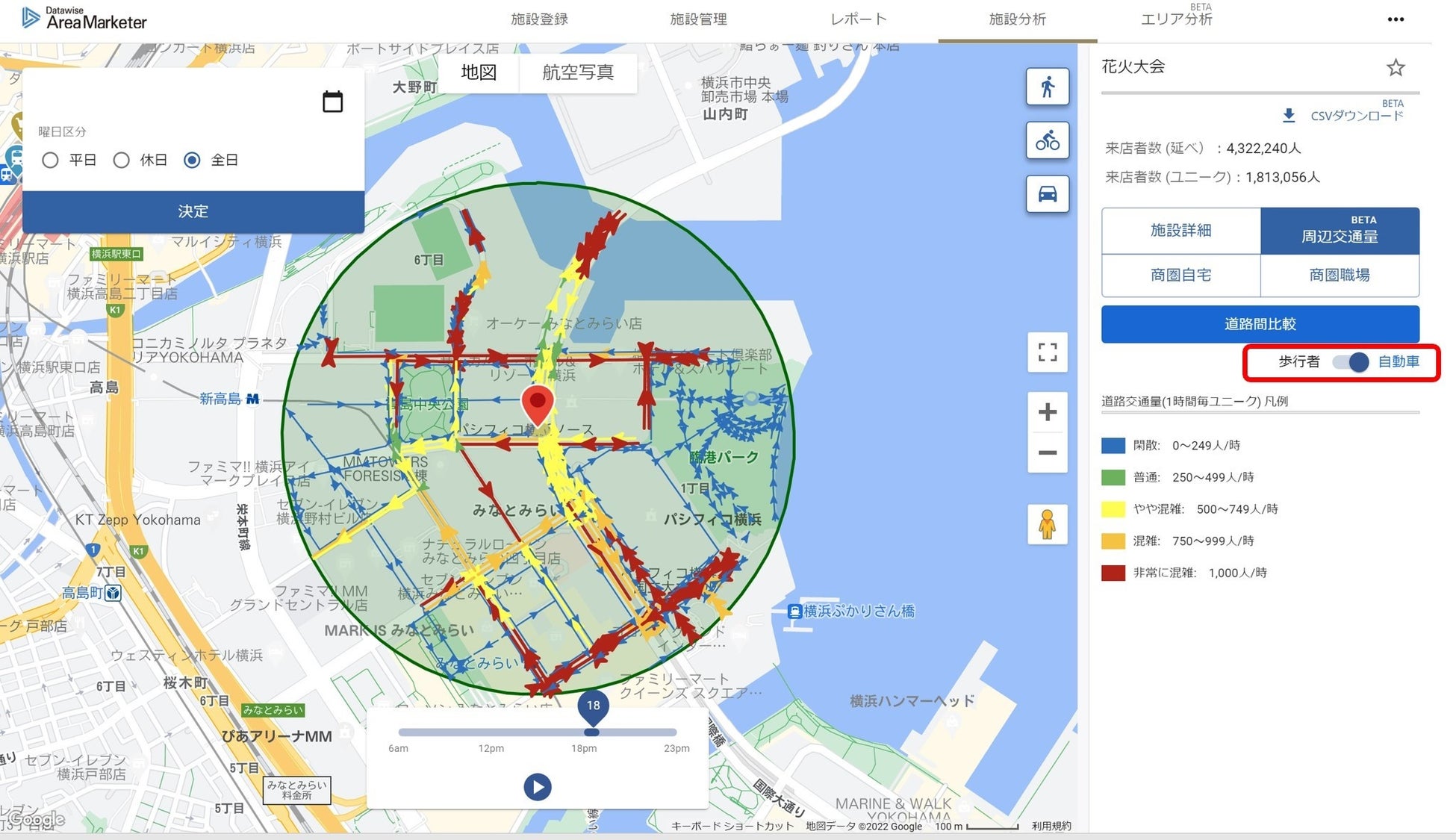 近隣エリアの混雑状況を「時間帯別」「詳細エリア別」「道路別」等の観点で、推計値による人流データの分析<*3>を行い、来場者誘導の効果等を定量的に検証するデータ提供支援を行います。<*3>株式会社データワイズによるサービス提供:https://www.datawise.co.jp/