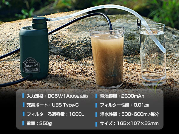 細菌99.9999%を除去するリチウム電池駆動型携帯浄水器
