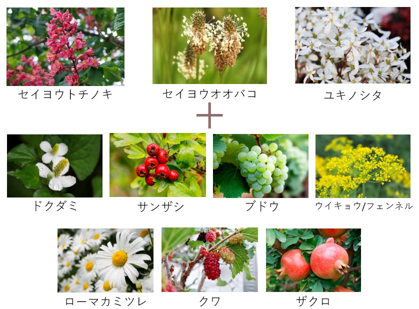 *¹ 「エイジーセオリー」共通成分である甘美な花を咲かせる植物成分のこと。 *⁷ 整肌:イザヨイバラエキス、カルノシン、カミツレ花エキス、保湿:アルテア根エキス *⁸ 混合ハーブエキス末(表示名称:ドクダミ、サンザシ、食用菊花、ブドウ)、桑葉エキス末、ザクロ果実エキス末、フェンネルエキス末、アムラ果実エキス末