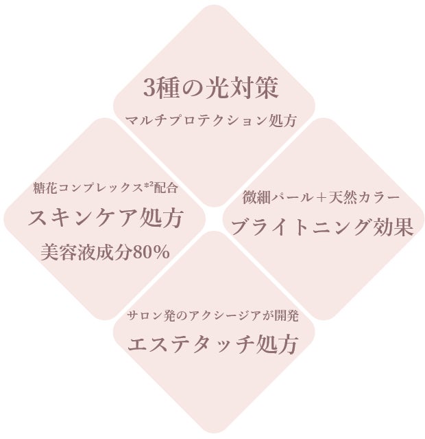 *¹ 糖花とは、「エイジーセオリー」共通成分である甘美な花を咲かせる植物成分のこと。 *² 糖花とは、「エイジーセオリー」共通成分である甘美な花を咲かせる植物成分のこと。ハリ・ツヤ:アルパインローズアクティブ(ロドデンドロンフェルギネウムエキス)、セイヨウトチノキ種子エキス、セイヨウオオバコ種子エキス、ユキノシタエキス、ドクダミエキス、サンザシエキス、ブドウ果実エキス、ローマカミツレ花エキス、マグワ根皮エキス、ザクロ果皮エキス、ウイキョウ果実油 *⁵ メイクアップ効果による。 *⁶ ハリ・ツヤ:セイヨウトチノキ種子エキス、セイヨウオオバコ種子エキス、ユキノシタエキス、ドクダミエキス、サンザシエキス、ブドウ果実エキス、ローマカミツレ花エキス、マグワ根皮エキス、ザクロ果皮エキス、ウイキョウ果実油