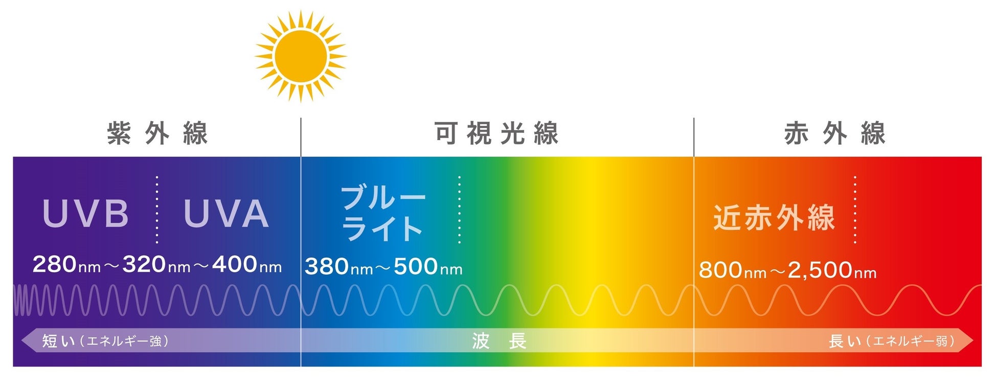 -UVA…地表に到達する紫外線の約9割を占め、雲や窓も透過し、季節を問わず降り注ぐため年間を通じた対策が必要な紫外線です。乾燥の原因となることが報告されています。