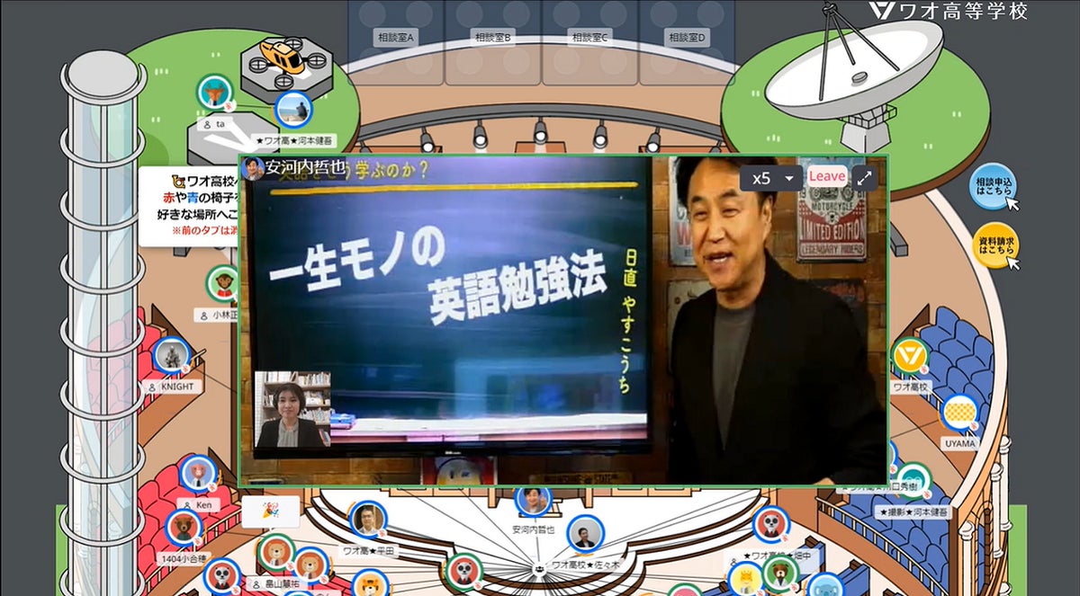 オープンスクールをはじめ、ワオ高校が主催するイベントは、このバーチャルキャンパスにオンラインでご来校いただき、本当の授業さながらの学び体験を楽しんでいただけます。