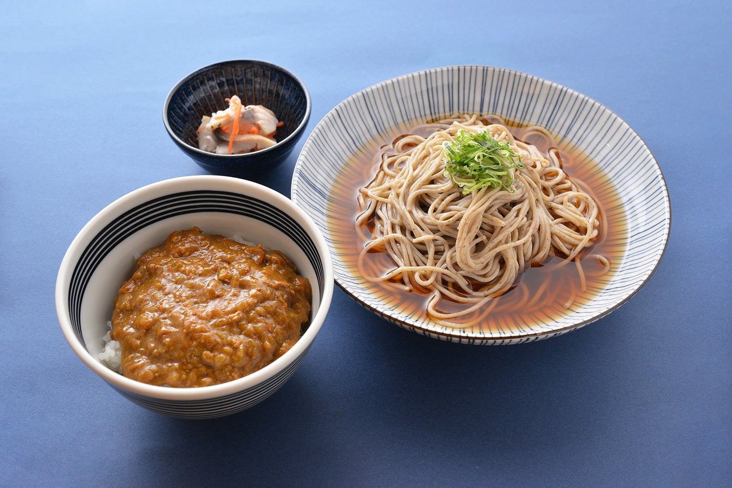 カレーそばでも人気のスパイスの効いたカレーを使用した「カレー丼セット」は、あっさりとがっつり、どちらの気分も叶えるメニュー。
