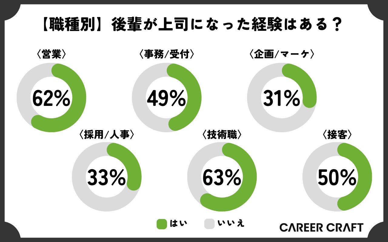 職種別に後輩上司を持った経験の有無を見ると、実力で仕事の結果がはっきりと出やすい「営業」「技術職」は、60%以上の人が後輩に昇進を先越された経験がありました。