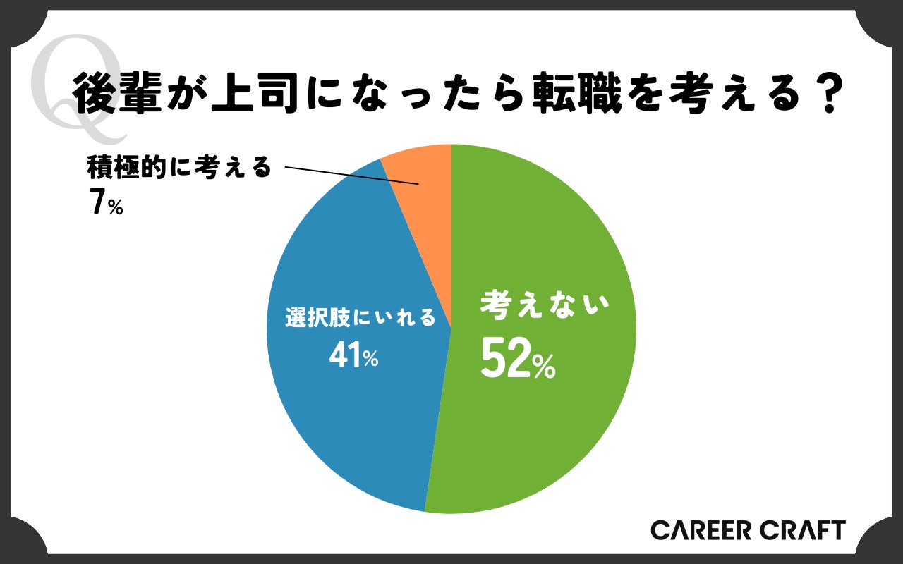 「積極的に考える」と合わせると、後輩が上司になったことがきっかけで48%の人が転職を考えるようになるようです。