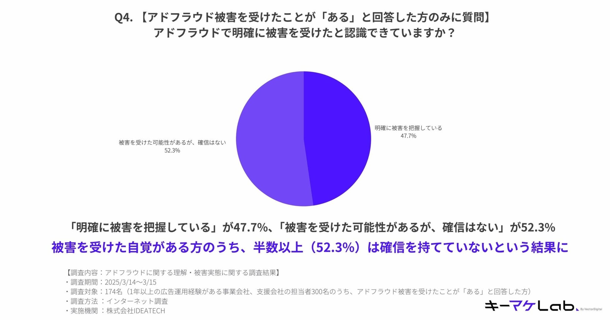 アドフラウドの被害を受けた経験があると回答した174名に対して質問したところ、47.7%が「明確に被害を把握している」と回答。