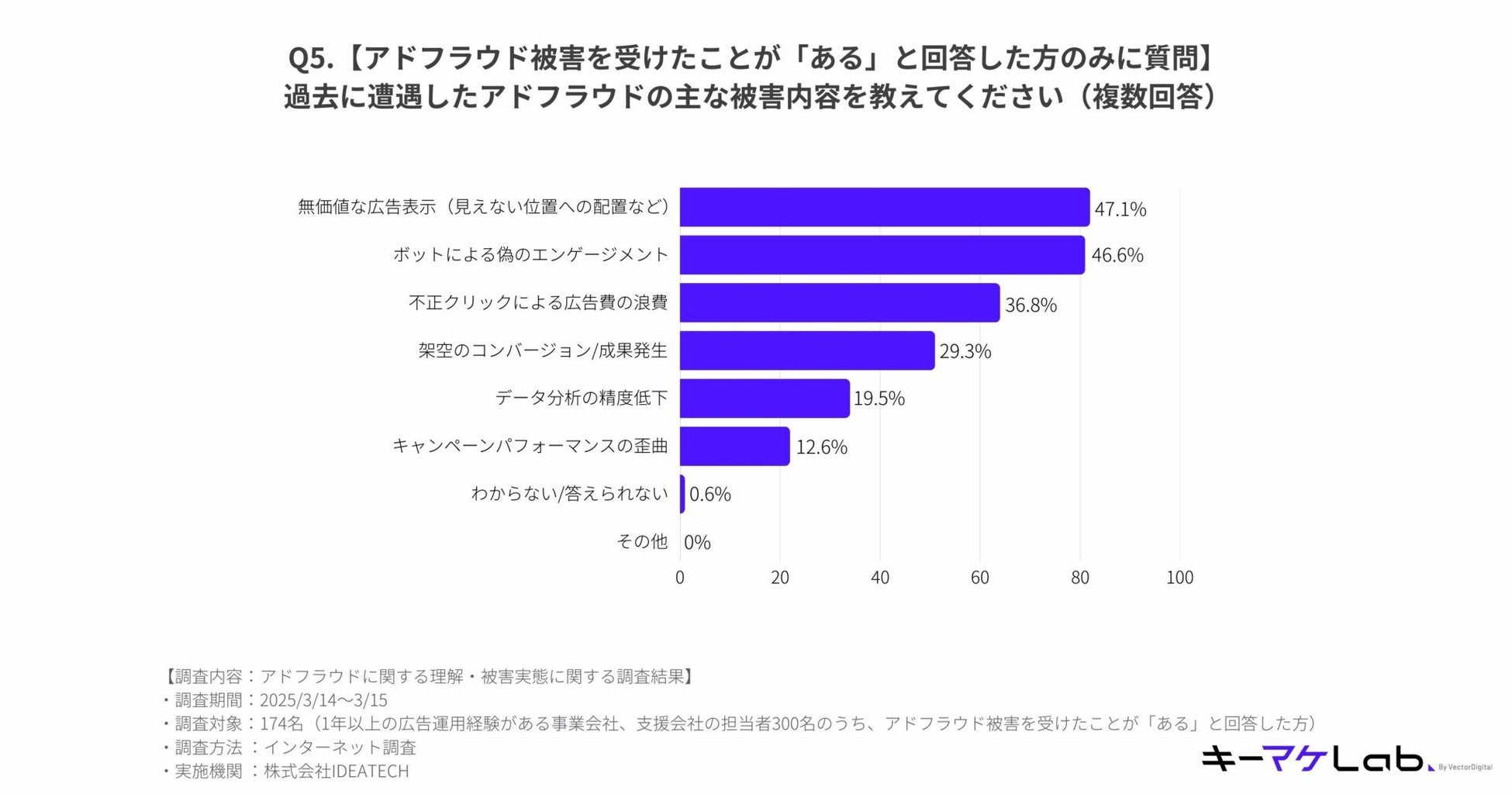 アドフラウドの被害を受けた経験があると回答した174名に対して質問したところ、最多が「無価値な広告表示(見えない位置への配置など)」で47.1%。