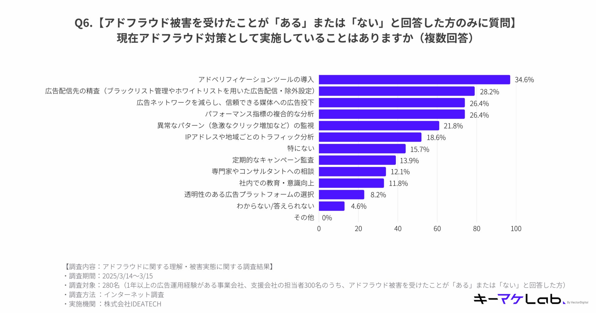 アドフラウド被害を受けたことが「ある」または「ない」と回答した280名に対して質問したところ、最多が「アドベリフィケーションツールの導入」で34.6%。