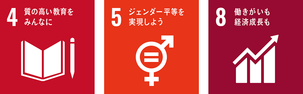 これらの取り組みは、SDGs「4.質の高い教育をみんなに」「5.ジェンダー平等を実現しよう」「8.働きがいも経済成長も」に繋がっていると考えています。