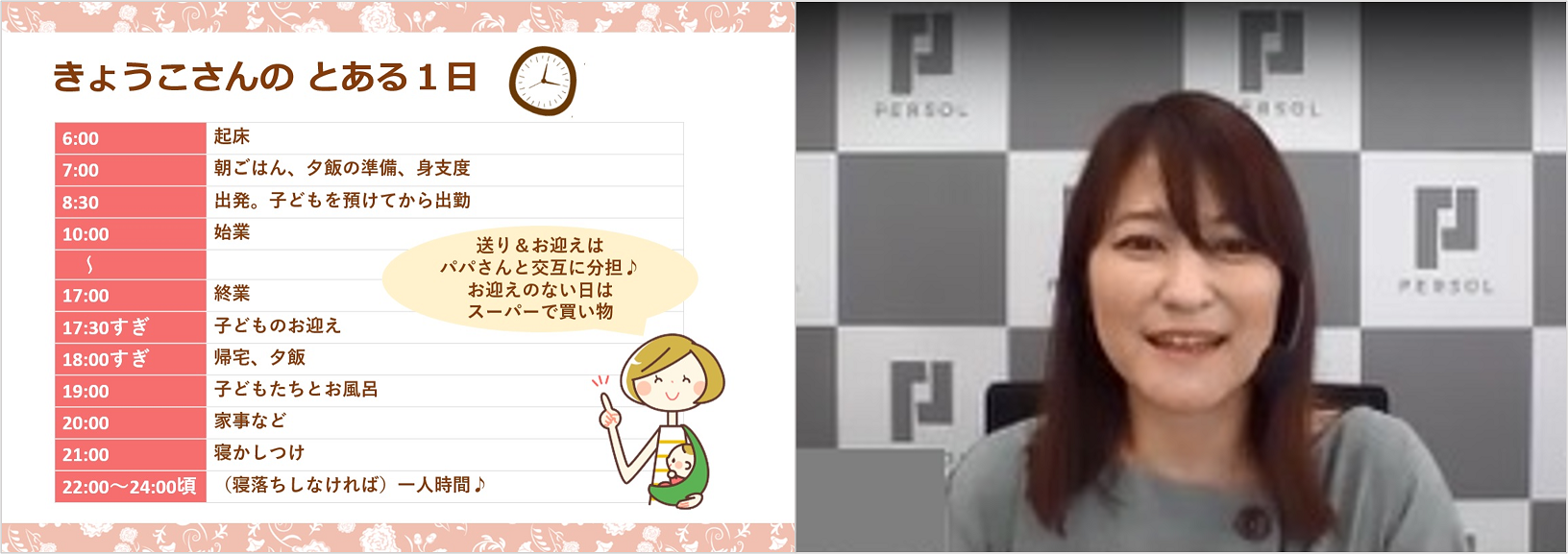 今回は、産育休を取得後、復職したばかりの新米ママスタッフ向けに、先輩ママスタッフを招いたオンラインセミナーを開催しました。仕事と育児の両立などの悩みや不安を共有するほか、先輩ママスタッフからのアドバイスを受けることで就業継続のコツやヒントを得る有意義な機会となりました。