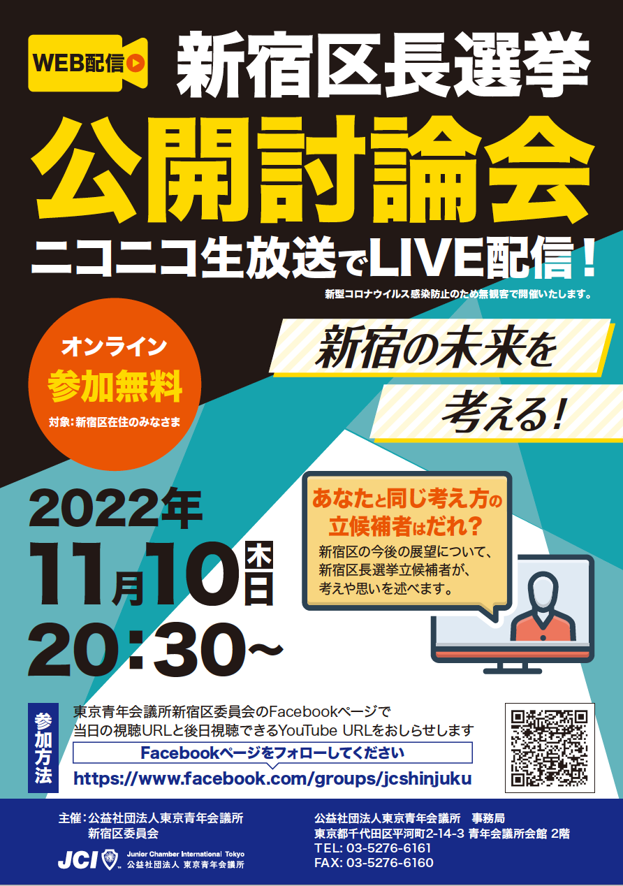 公益社団法人東京青年会議所(所在地:東京都千代田区平河町、理事長:山本 健太)は、新宿区長選挙の公開討論会を11月10日(木)20:30よりニコニコ生放送にて生配信いたします。