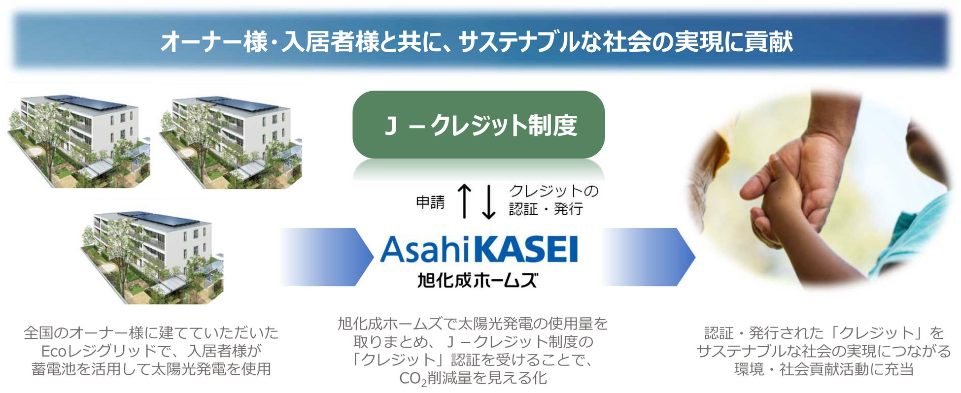 旭化成ホームズ株式会社(本社:東京都千代田区、代表取締役社長:川畑 文俊)は、当社のマテリアリティ「With Environment」の取り組みの一つとして、環境貢献と防災力強化を実現する賃貸住宅「Ecoレジグリッド」で発電した電気のうち、共用部・各住戸で使用した電力(以下、自家消費電力)の環境価値を取りまとめ、「クレジット」として国が認証するJ-クレジット制度の登録認証を2024年1月26日付で取得しましたのでお知らせします。