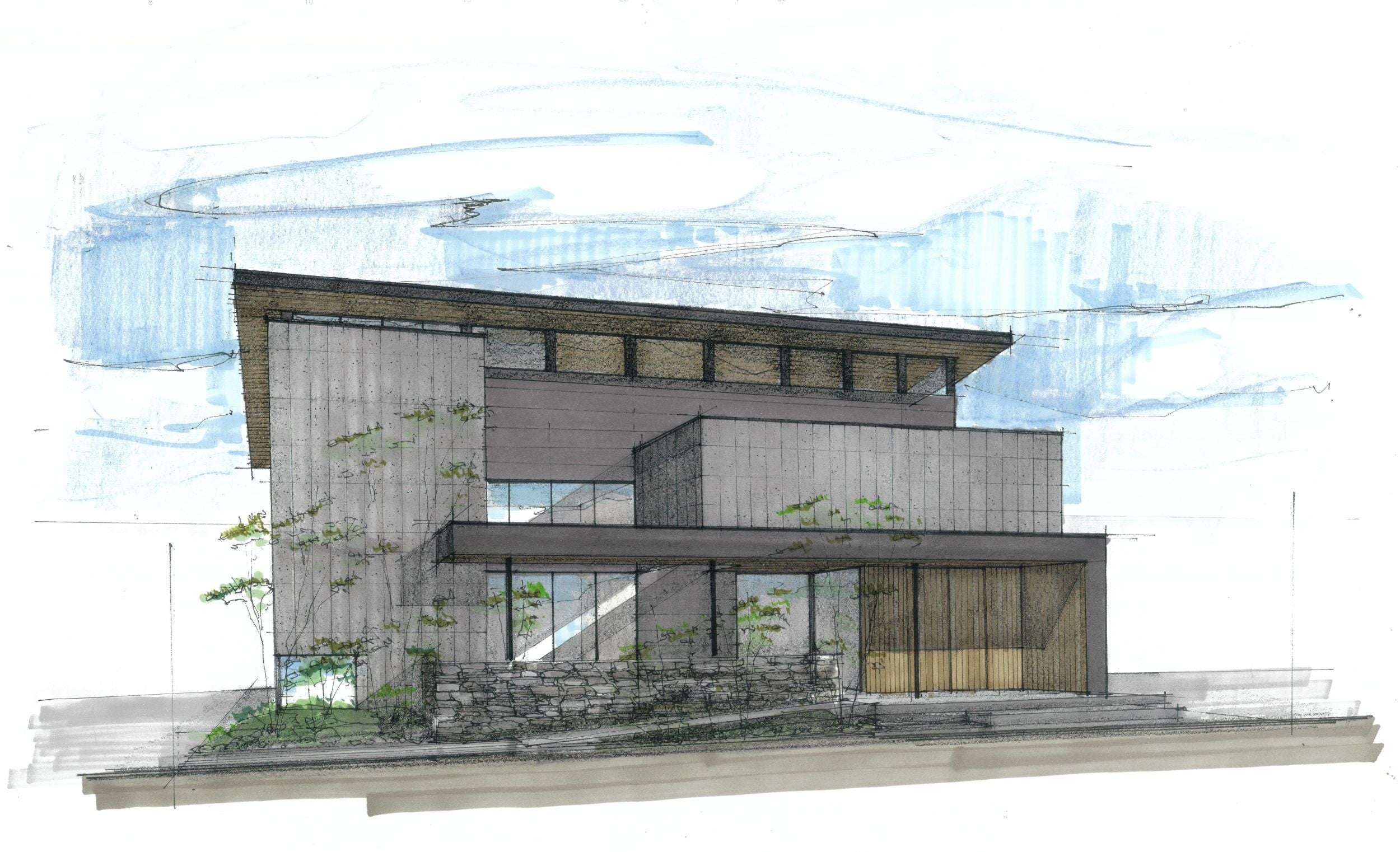 展示場外観は、大屋根を用いた和モダンの落ち着いたイメージで、黒を基調として石・タイル・木といった素材感を活かし、ショールームとモデルハウスとしての機能を保ちつつ、端正な1つの邸宅としております。