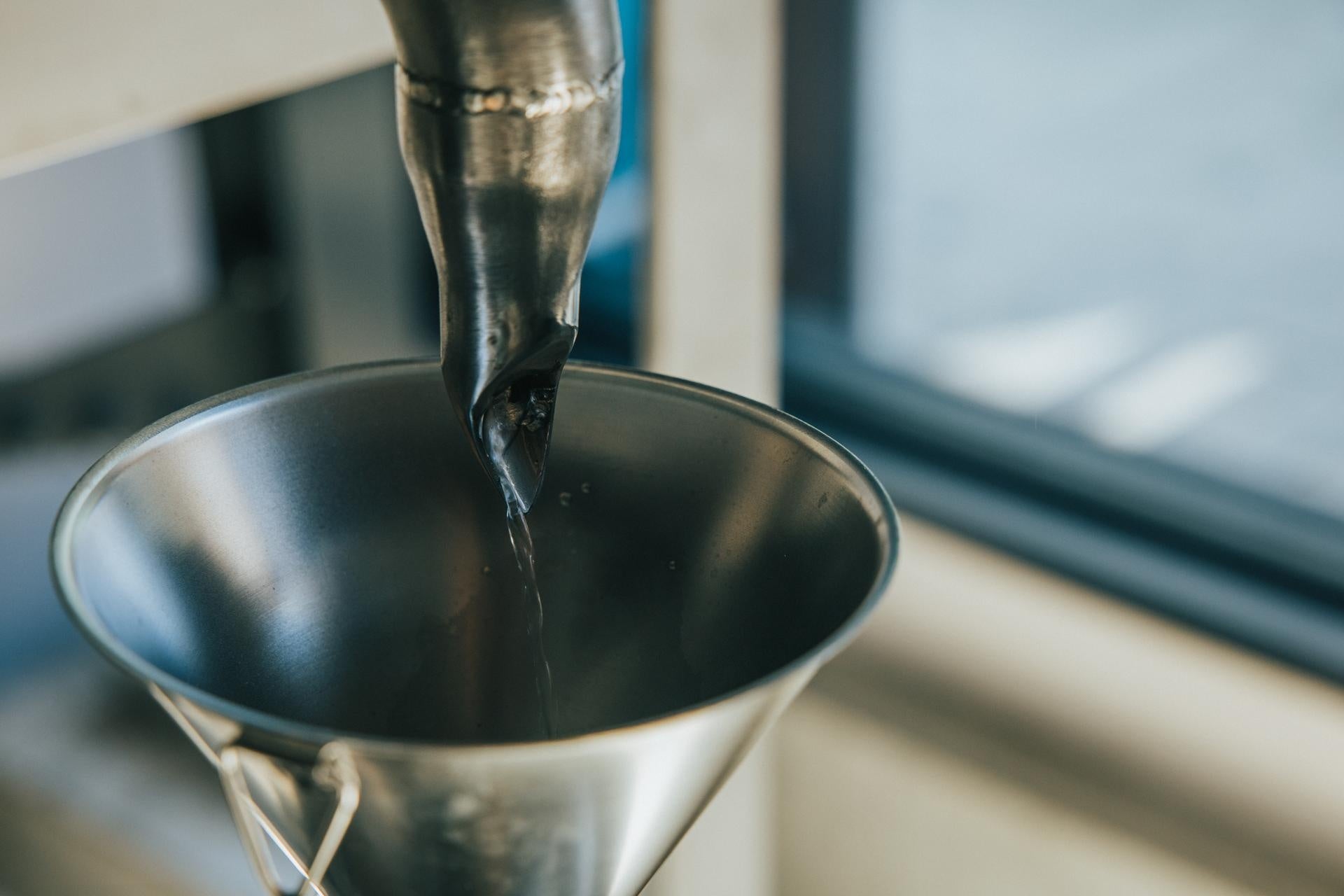 香りの元を含んだ水蒸気が冷却器で冷やされ、油と水の2層の液体となって出てきます。この油が貴重な「精油」です。水にもわずかに香り成分が含まれているため、芳香蒸留水として活用されます。