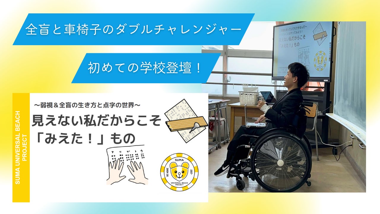 障がいがある人もない人も、誰もが一緒に楽しめるビーチづくりを目指すNPO法人須磨ユニバーサルビーチプロジェクトが運営する、就労継続支援B型事業所Baseの全盲と車椅子の利用者と弱視の利用者が、オンラインおよびオフラインで登壇を行いました。現在B型に通っている利用者が学校で講師として登壇することは日本で初めて(自社調べ、元B型利用者の事例あり)、全盲と車椅子のダブルチャレンジャーの方が学校で講師として登壇することも日本で初めてです。