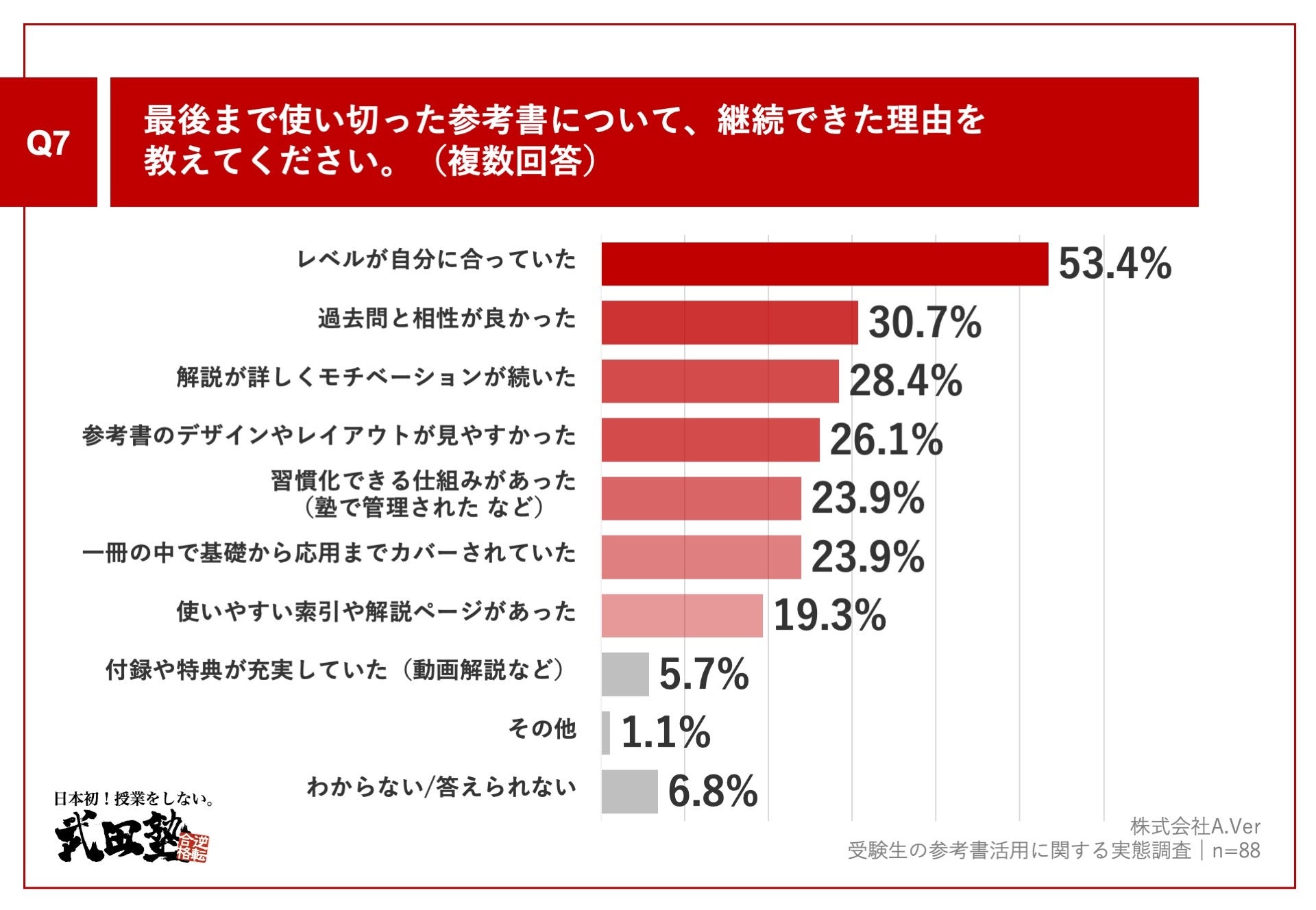 Q2で「1冊も使い切らなかった」以外を回答した方に、「Q7.最後まで使い切った参考書について、継続できた理由を教えてください。(複数回答)」(n=88)と質問したところ、「レベルが自分に合っていた」が53.4%、「過去問と相性が良かった」が30.7%、「解説が詳しくモチベーションが続いた」が28.4%という回答となりました。